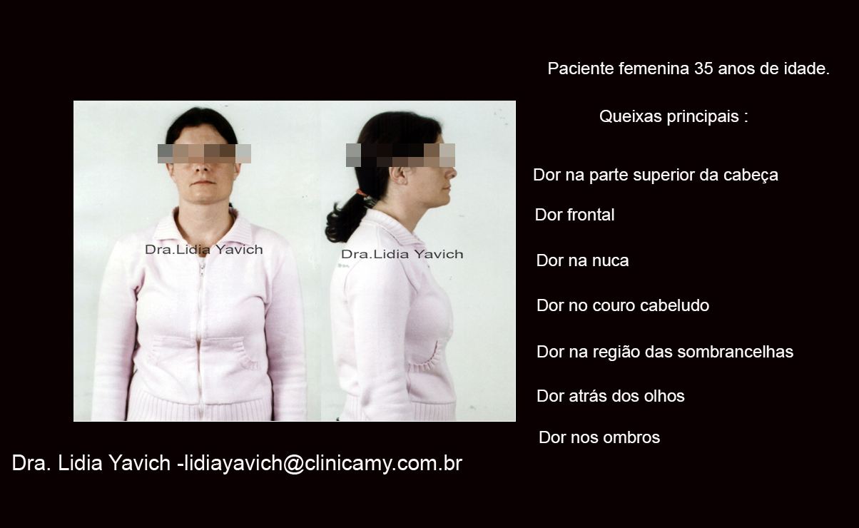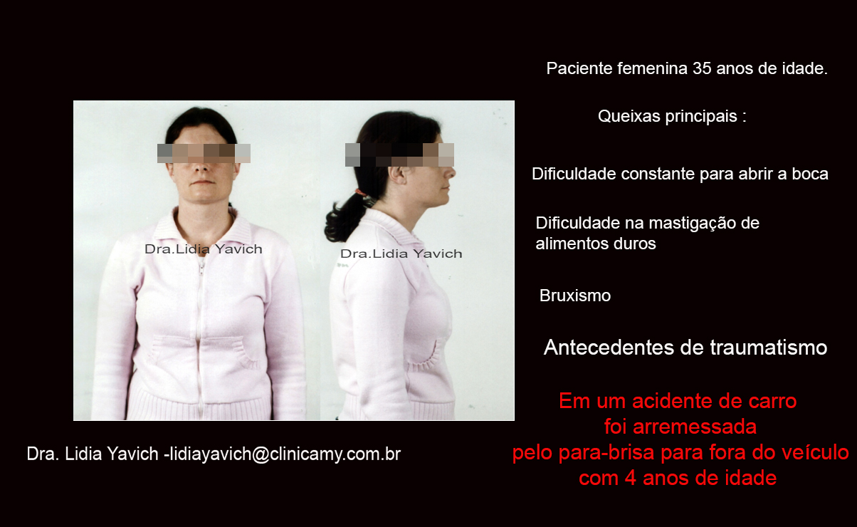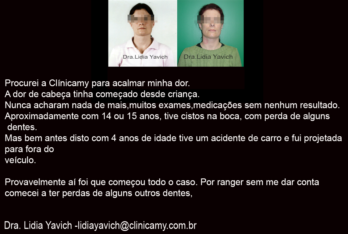 Procurei a Clínicamy para acalmar minha dor. A dor de cabeça tinha começado desde criança. Nunca acharam nada de mais,muitos exames,medicações sem nenhum resultados. Aproximadamente com 14 ou 15 anos, tive cistos na boca, com perda de alguns dentes. Mas bem antes disto, com 4 anos de idade, tive um acidente de carro e fui projetada para fora do veículo. Provavelmente aí foi que começou todo o caso. Por ranger sem me dar conta comecei a ter perdas de alguns outros dentes.