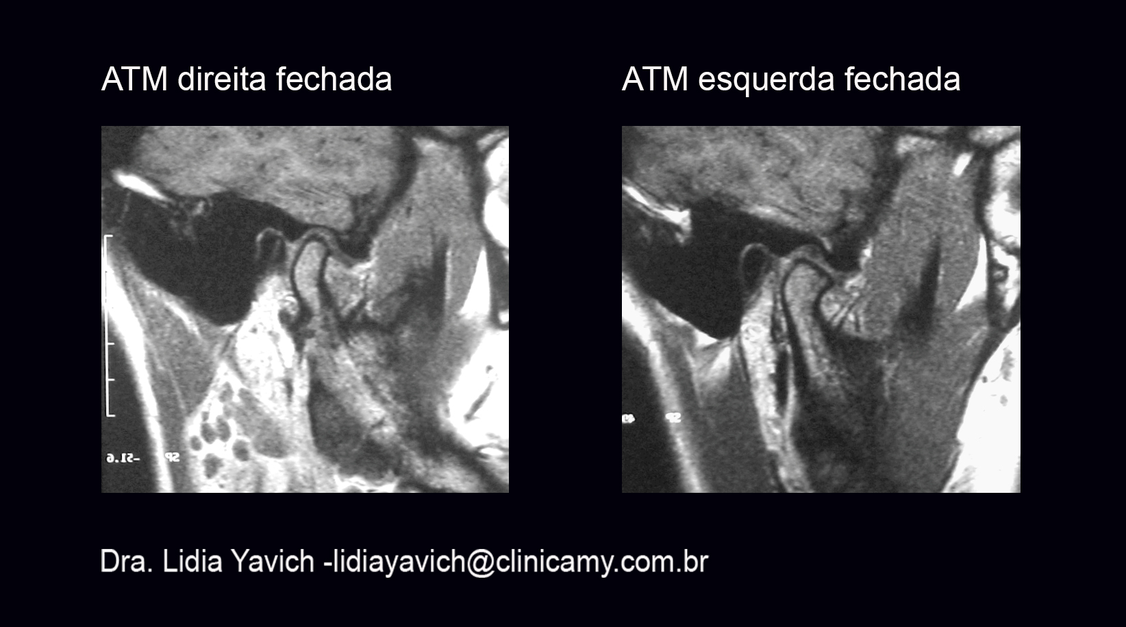 Um corte da RNM em boca fechada mostra um disco de pequeno tamanho deslocado anteriormente do lado direito. Nas RNM em boca aberta ( não incluídas neste post) mostra a não recaptura do lado direito. Aplainamento significativo da superfície anterior do processo articular do lado esquerdo. Angulação anterior do processo articular do lado direito com aplainamento de suas superfícies posterior e anterior. ( Modificação estruturais do processo condilar como uma das sequelas de traumatismo na infância)