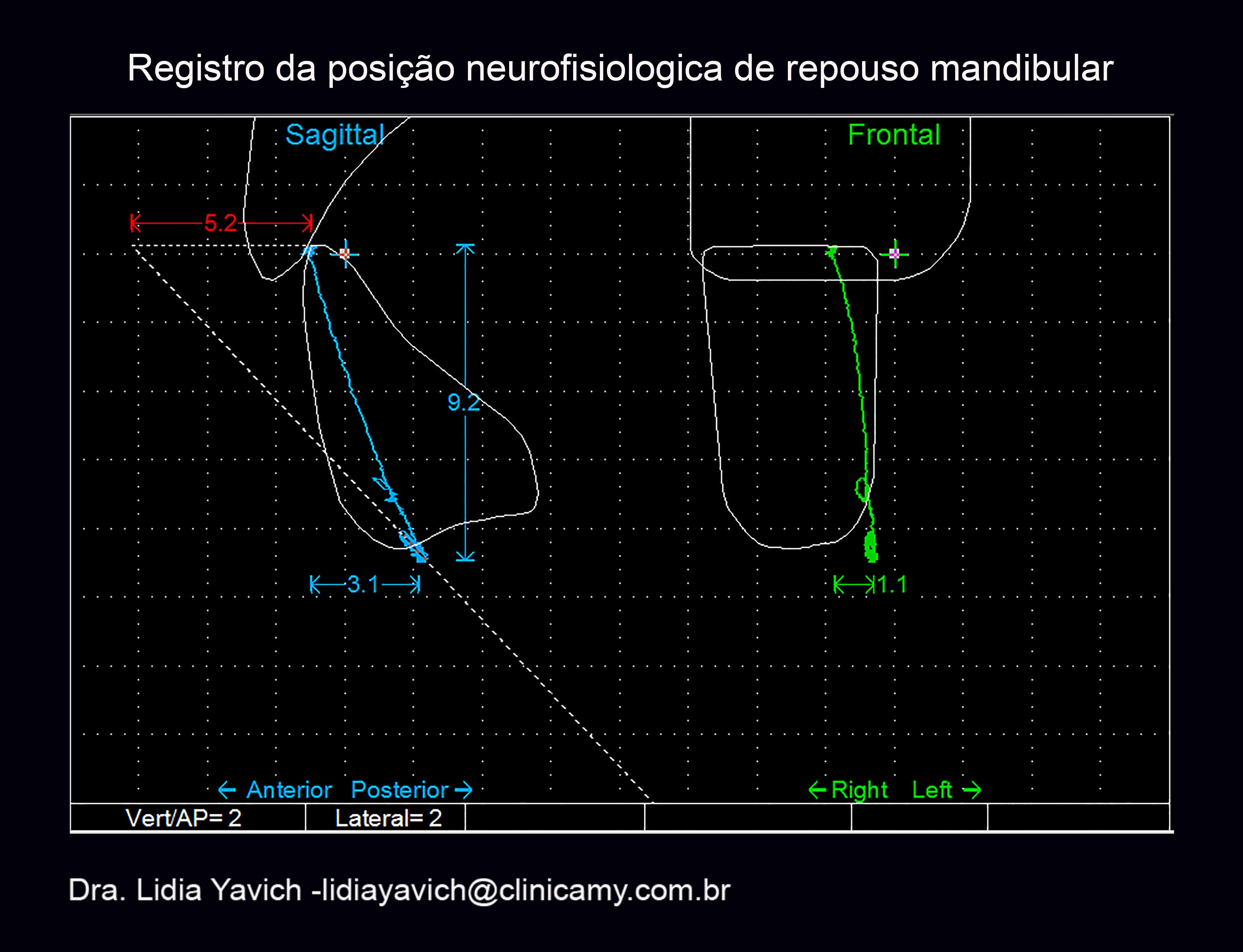 Temos em conta não só as informações do magnetógrafo após a desprogramação eletrônica, mas fundamentalmente a informação da ressonância nuclear magnética para a decisão do registro da mordida para a construção tridimensional do dispositivo. Para isso utilizamos a técnica neuromuscular fisiológica. A paciente apresenta um espaço livre patológico de 9,2 mm e uma retroposição mandibular de 5,2 mm.