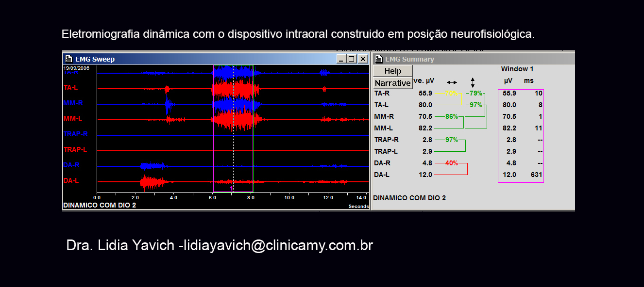 Exame eletromiográfico dinâmico COM O DISPOSITIVO INTRAORAL CONSTRUÍDO EM POSIÇÃO NEUROMUCULAR FISIOLÓGICA. Nesse protocolo se solicita ao paciente que abra a boca, feche, morda forte e degluta COM O DISPOSITIVO COLOCADO.