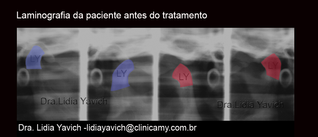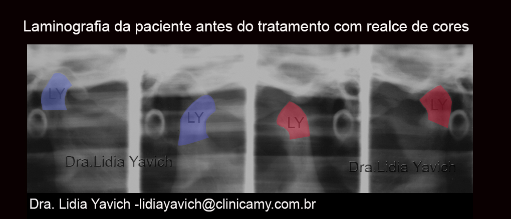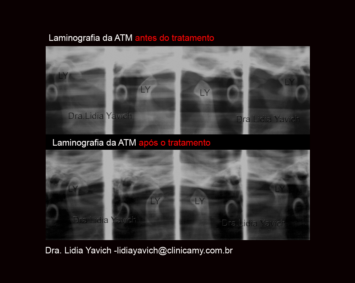 Laminografias comparativas da paciente: inicial em oclusão habitual onde pode se observar a retroposição das cabeças da mandíbula e com o dispositivo intraoral em posição neurofisiológica com a descompressão tridimensional do espaço retrodiscal.