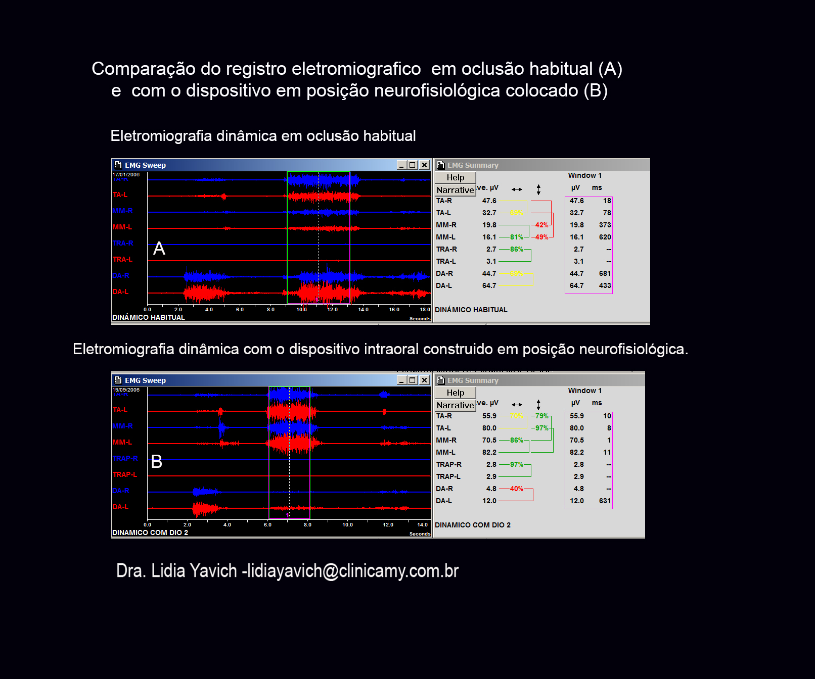 Comparação dos registros eletromiográficos da paciente (A) em oclusão habitual e (B) com o dispositivo em posição neuromuscular fisiológica instalado.