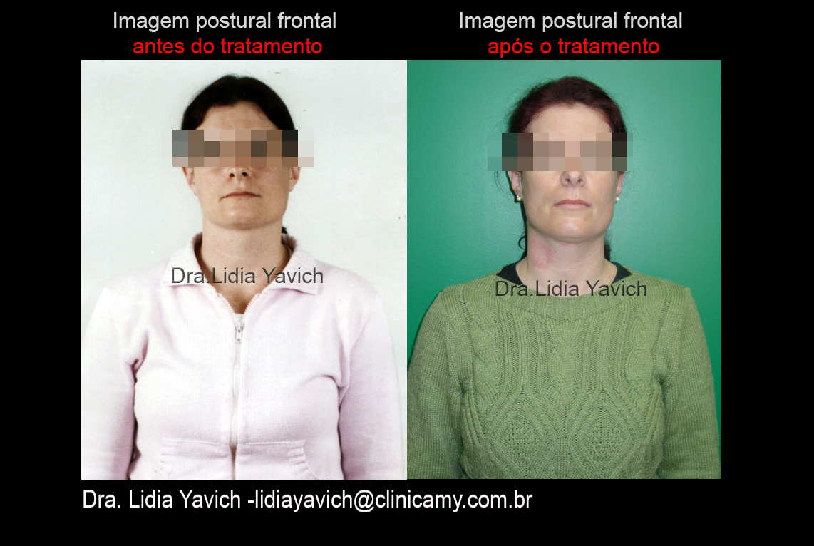 Imagem postural de frente da paciente em oclusão habitual e com o dispositivo instalado. Recuperação tridimensional da dimensão vertical. Melhora no posicionamento dos ombros e da cabeça.