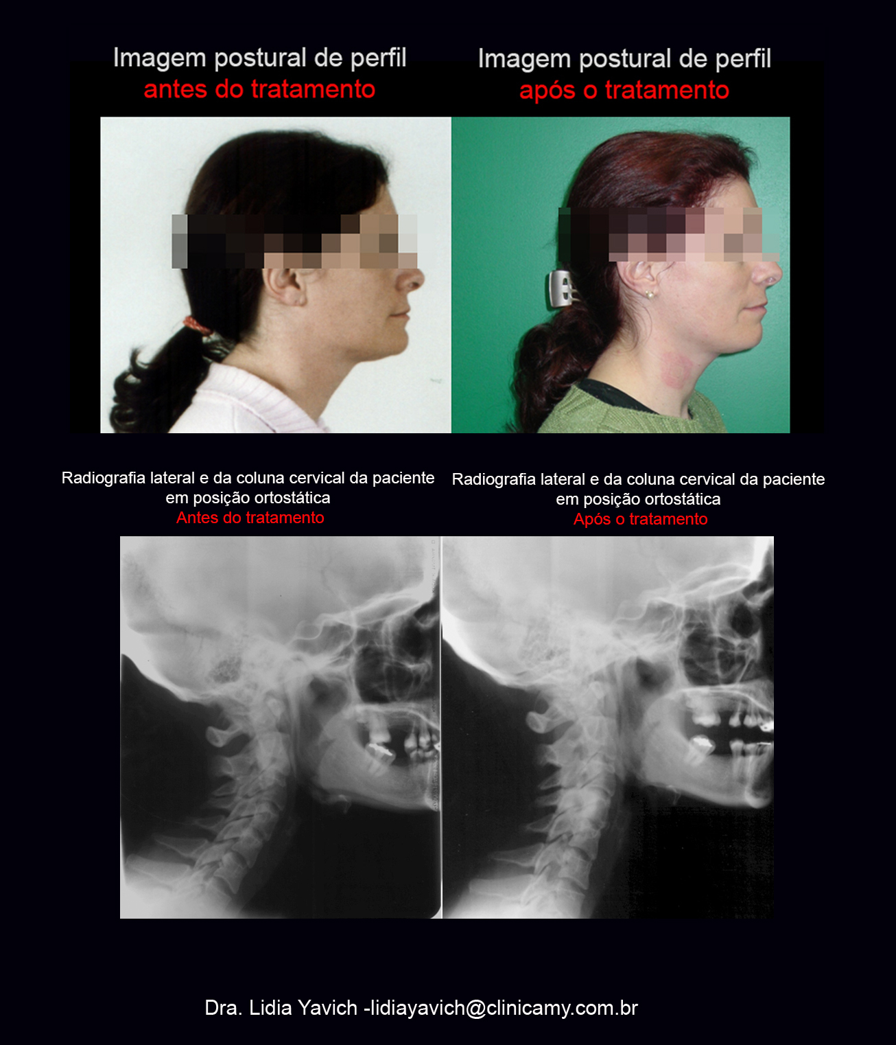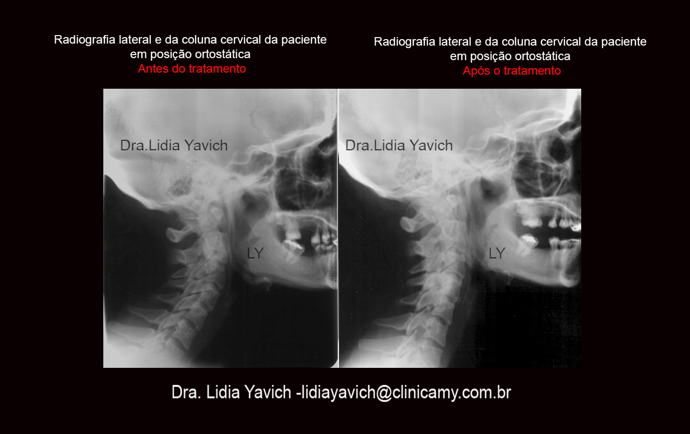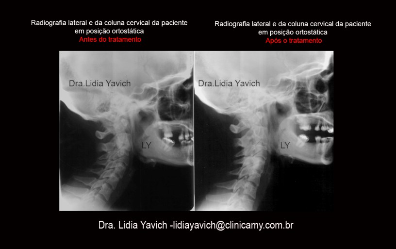 Comparação das imagens posturais de perfil com a imagem da radiografia lateral da coluna cervical com o dispositivo colocado em boca. Melhora da coluna cervical da paciente.