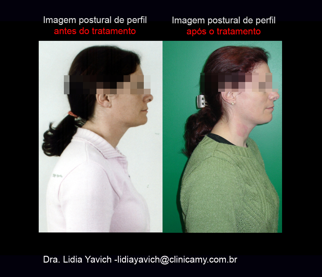 Imagem postural de perfil da paciente em oclusão habitual e com o dispositivo instalado. Recuperação tridimensional da dimensão vertical. Melhora no posicionamento dos ombros e da cabeça.
