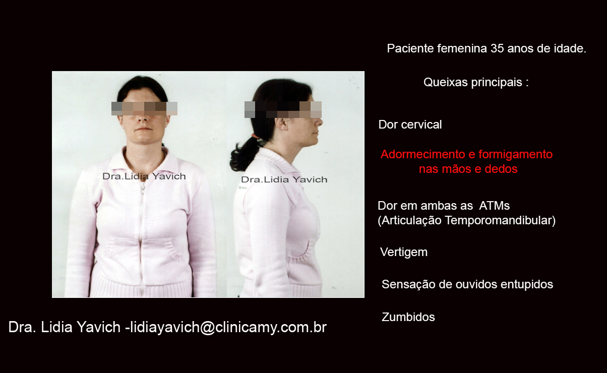 Dor cervical, adormecimento e formigamento nas mãos e dedos. Dor em ambas as articulações temporomandibulares. Vertigem, sensação de ouvidos entupidos. Zumbidos.