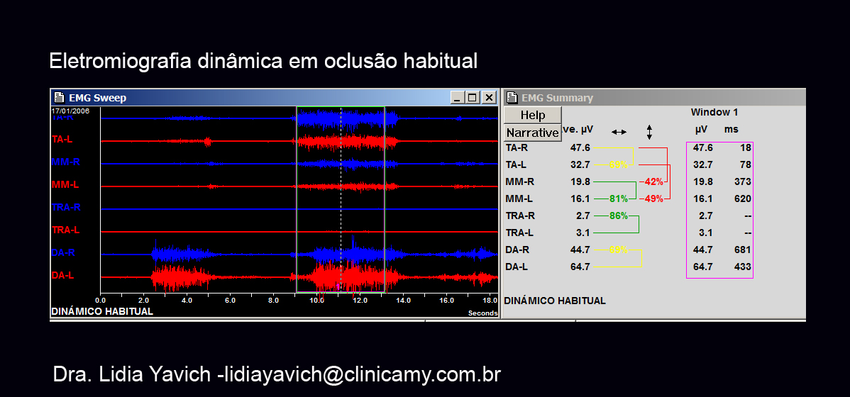 Neste registro eletromiográfico são medidos oito músculos: os temporais anteriores direito e esquerdo, masseteres direito e esquerdo, trapézios direito e esquerdo e digástricos direito e esquerdo. Observa-se a atividade dos temporais superficiais direito e esquerdo e de ambos os masseteres e a redução de atividade nos digástricos quando o paciente está mordendo.