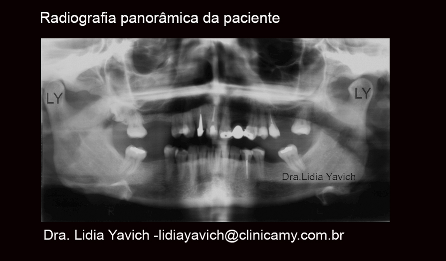 Ao exame radiográfico observa-se ausência dos elementos dentais 16,15,22,26,27,38 36,46 e 47. Demais elementos dentais permanentes presentes. A imagem radiográfica em incidência panorâmica mostra assimetria do corpo e ramo ascendente da mandíbula.