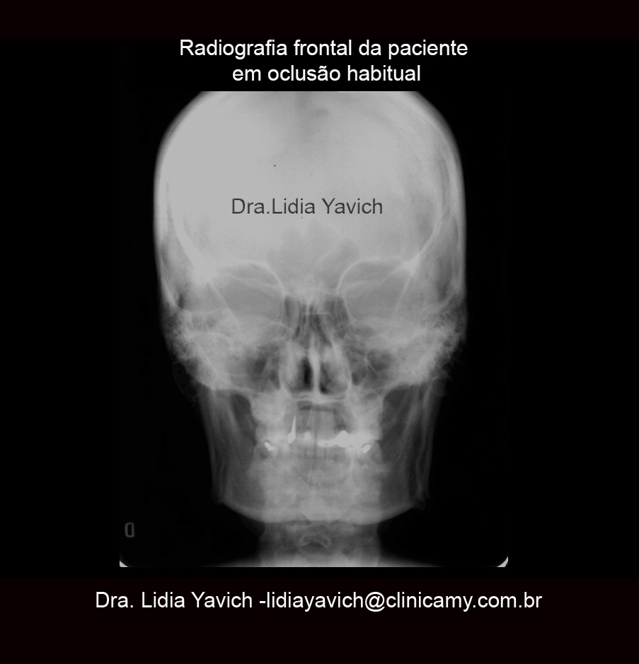 Radiografia frontal da paciente em oclusão habitual. ROCABADO (1984) refere que a posição ideal da cabeça no espaço depende de três planos: plano bipupilar, plano ótico e plano transversal oclusal. Este três planos mantêm entre si uma relação horizontal e paralela que assegura a estabilidade postural do crânio. E EVIDENTE QUE ISSO NÃO OCORRE NESTA PACIENTE .
