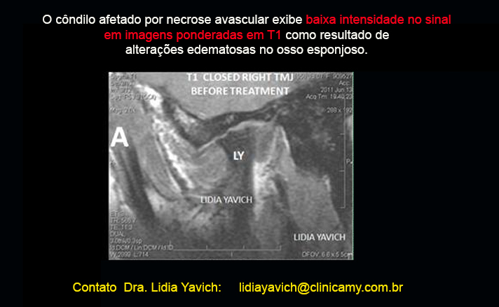 O côndilo afetado por necrose avascular apresenta baixo sinal nas imagens ponderadas em T1 como resultado de alterações edematosas no osso trabecular.
