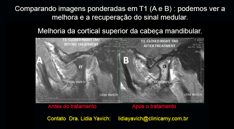 Comparando imagens ponderadas em T1: A (antes do tratamento) e B (após o tratamento): podemos ver a melhora e a recuperação do sinal medular. Melhoria da cortical superior da cabeça mandibular.