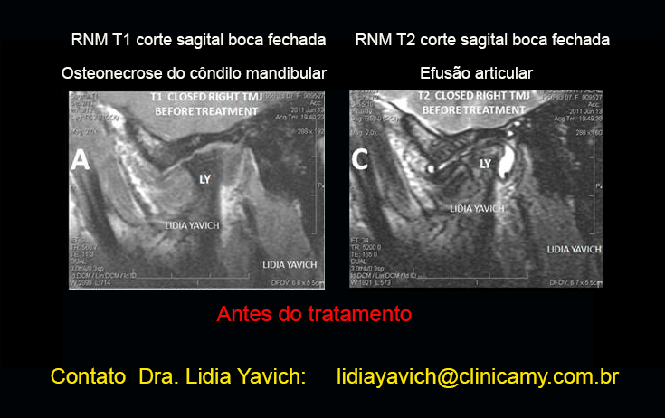 O mesmo corte sagital do côndilo em T1 e T2. Imagem A mostrando a osteonecrose da cabeça da mandíbula e imagem C mostrando o derrame articular.