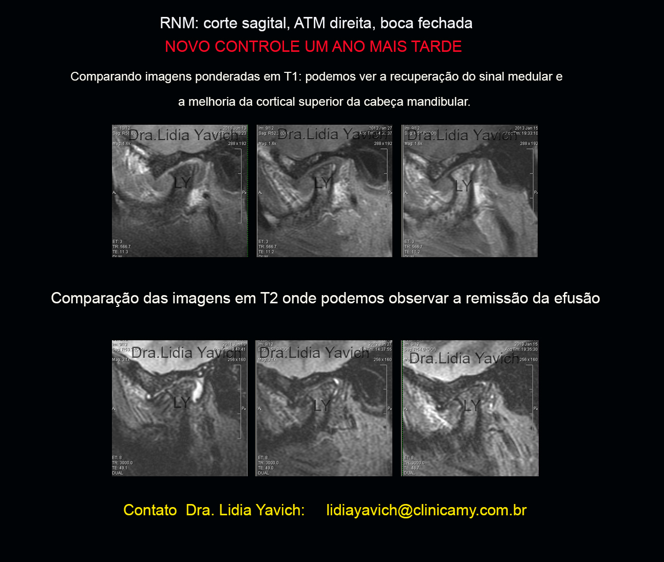 Comparando as imagens ponderadas em T1 (A e B), onde podemos ver a melhoria e recuperação do sinal medular e a cortical superior da cabeça mandibular. Em T2 (C e D) é nítido (en C) o sinal inflamatório e na outra (D) a remissão do derrame.