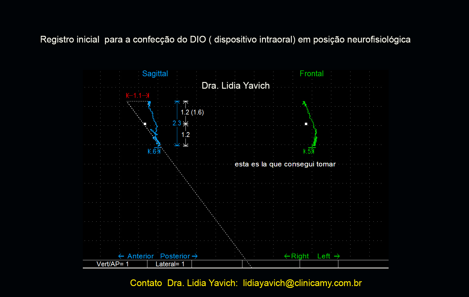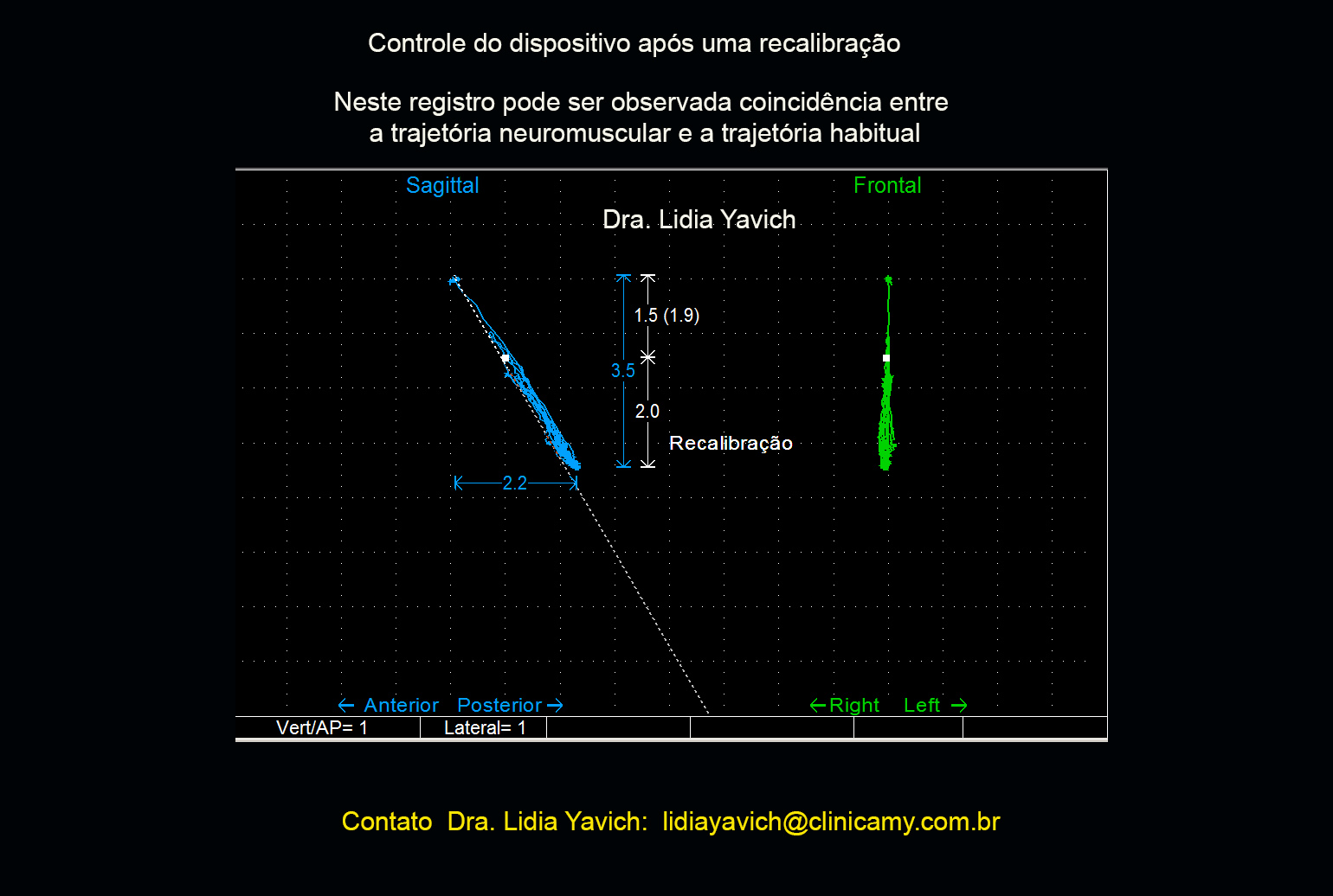 Neste outro registro onde estamos recalibrando o dispositivo da paciente, podemos ver a coincidência da trajetória habitual com a trajetória neuromuscular. A paciente consegue desprogramar melhor e podemos confeccionar um dispositivo melhor.