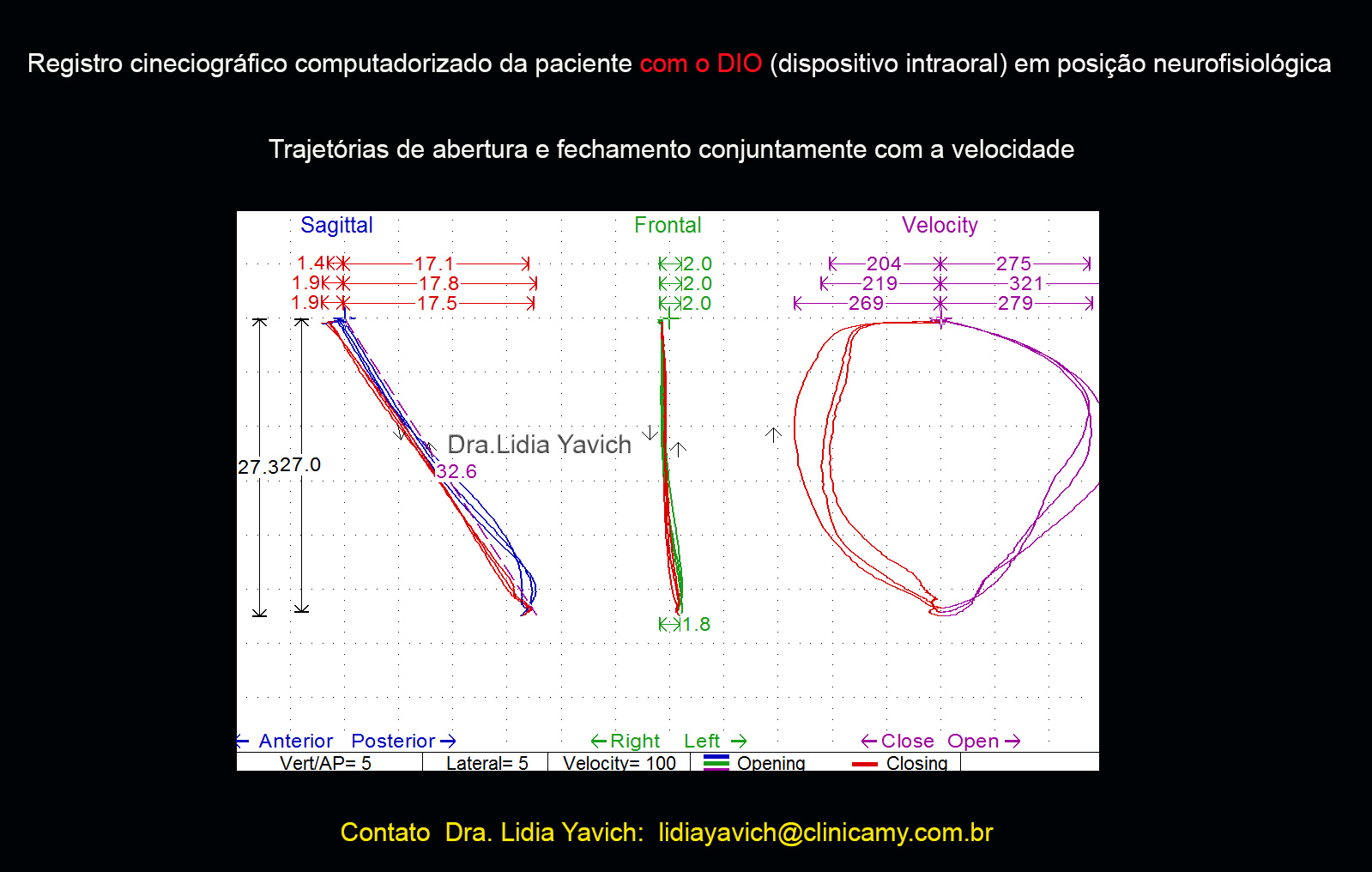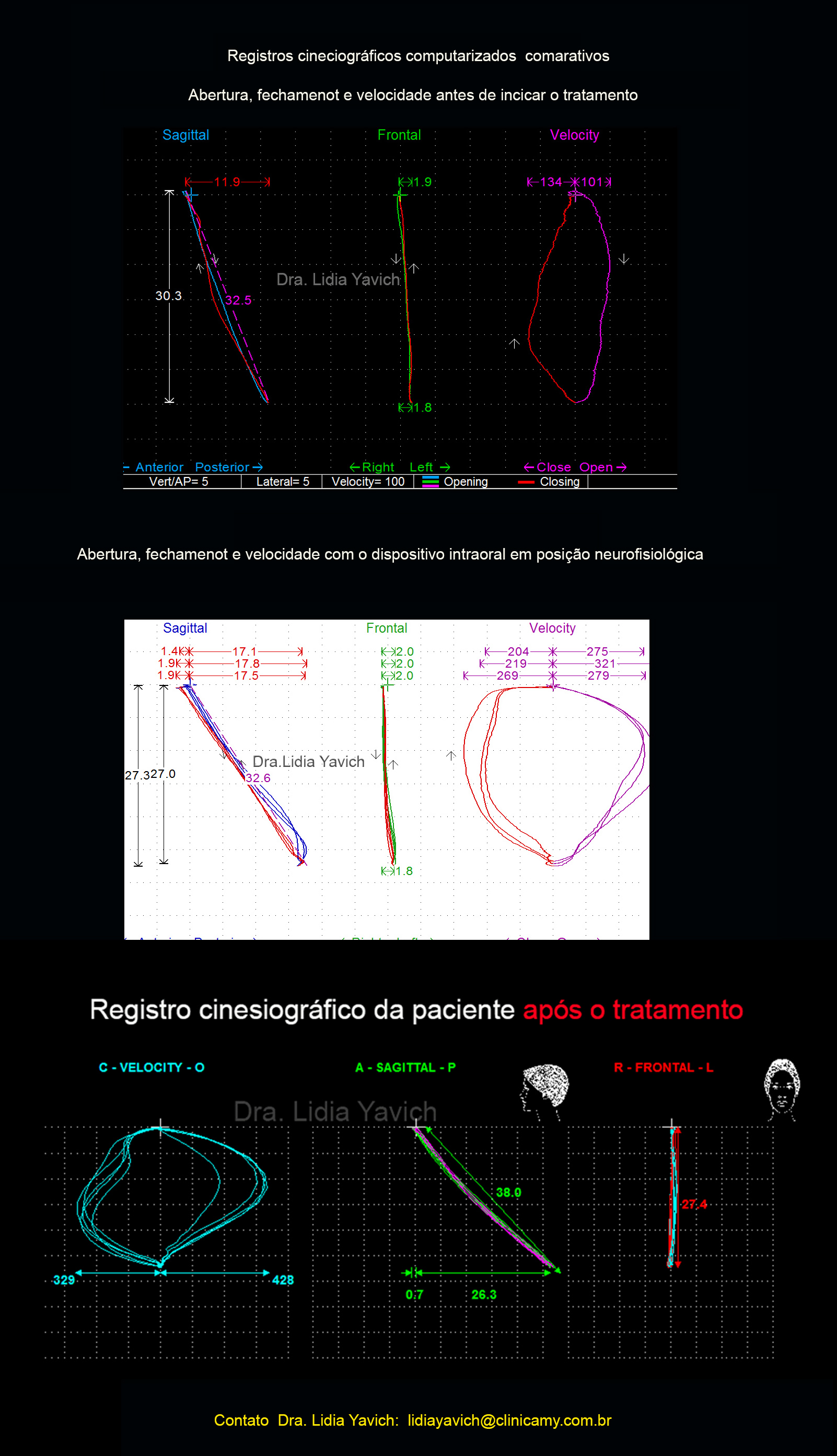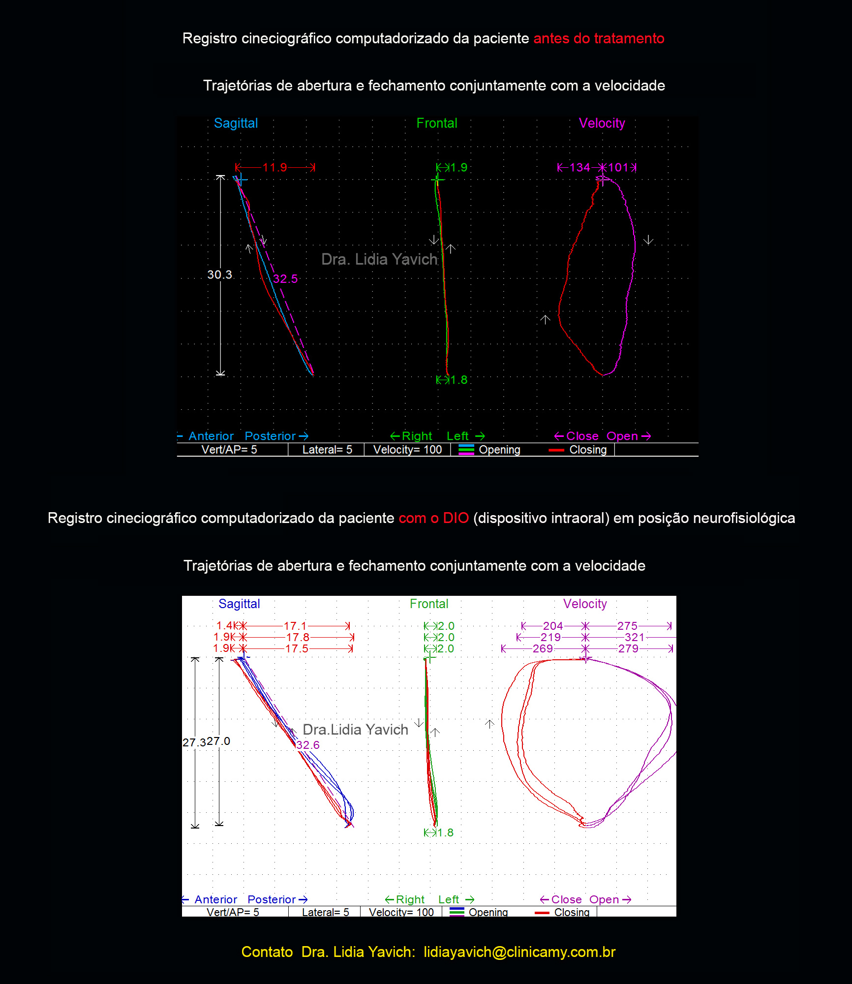Registros cineciográficos comparativos de abertura,fechamento e velocidade: em posição habitual antes do tratamento, com o DIO (dispositivo intraoral) e na finalização do tratamento.