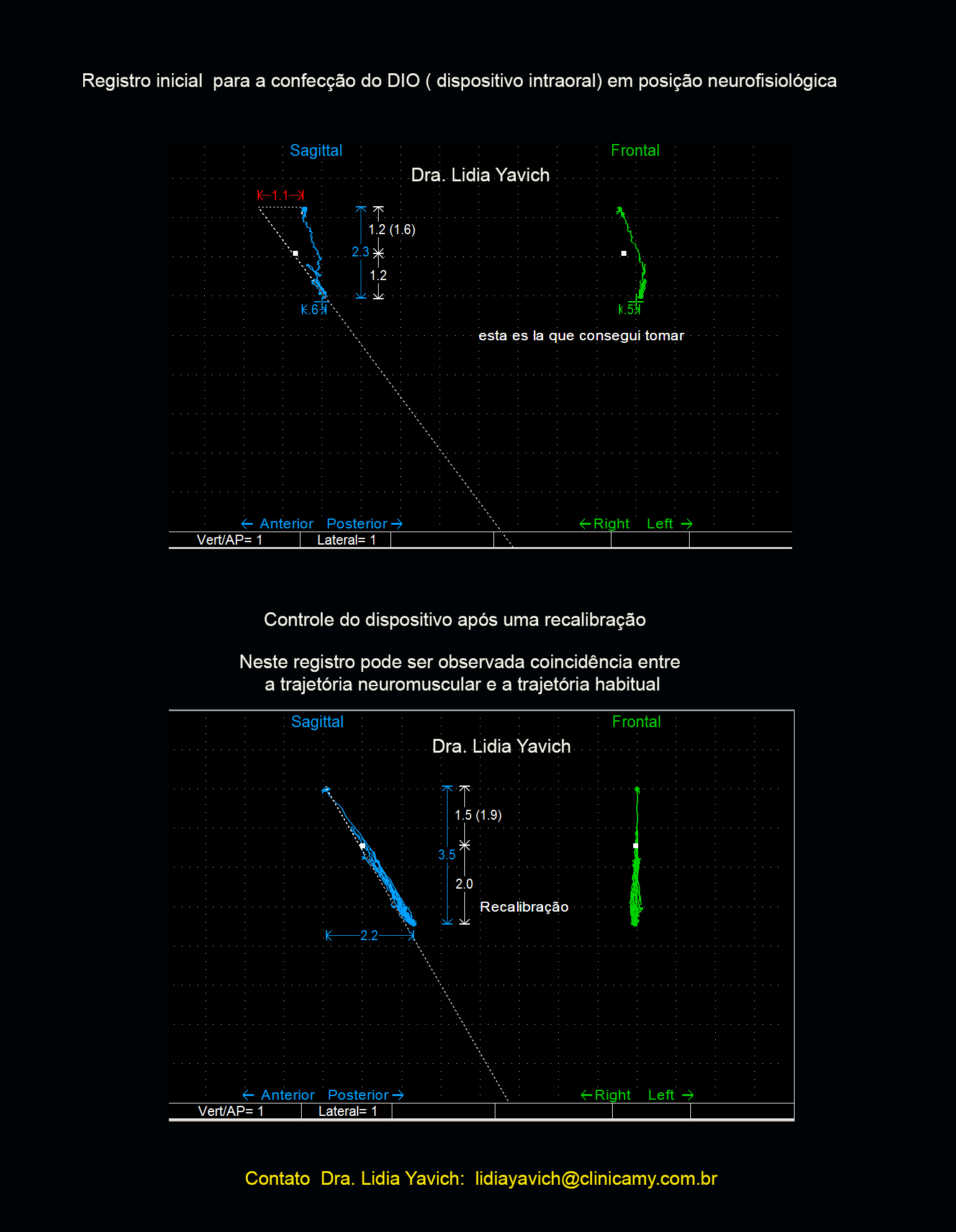 Registros de posição de repouso comparativos : antes do tratamento e registro recalibrando o DIO (dispositivo intraoral). Na recalibração já podemos observar a coincidência da trajetória habitual com a trajetória neuromuscular.