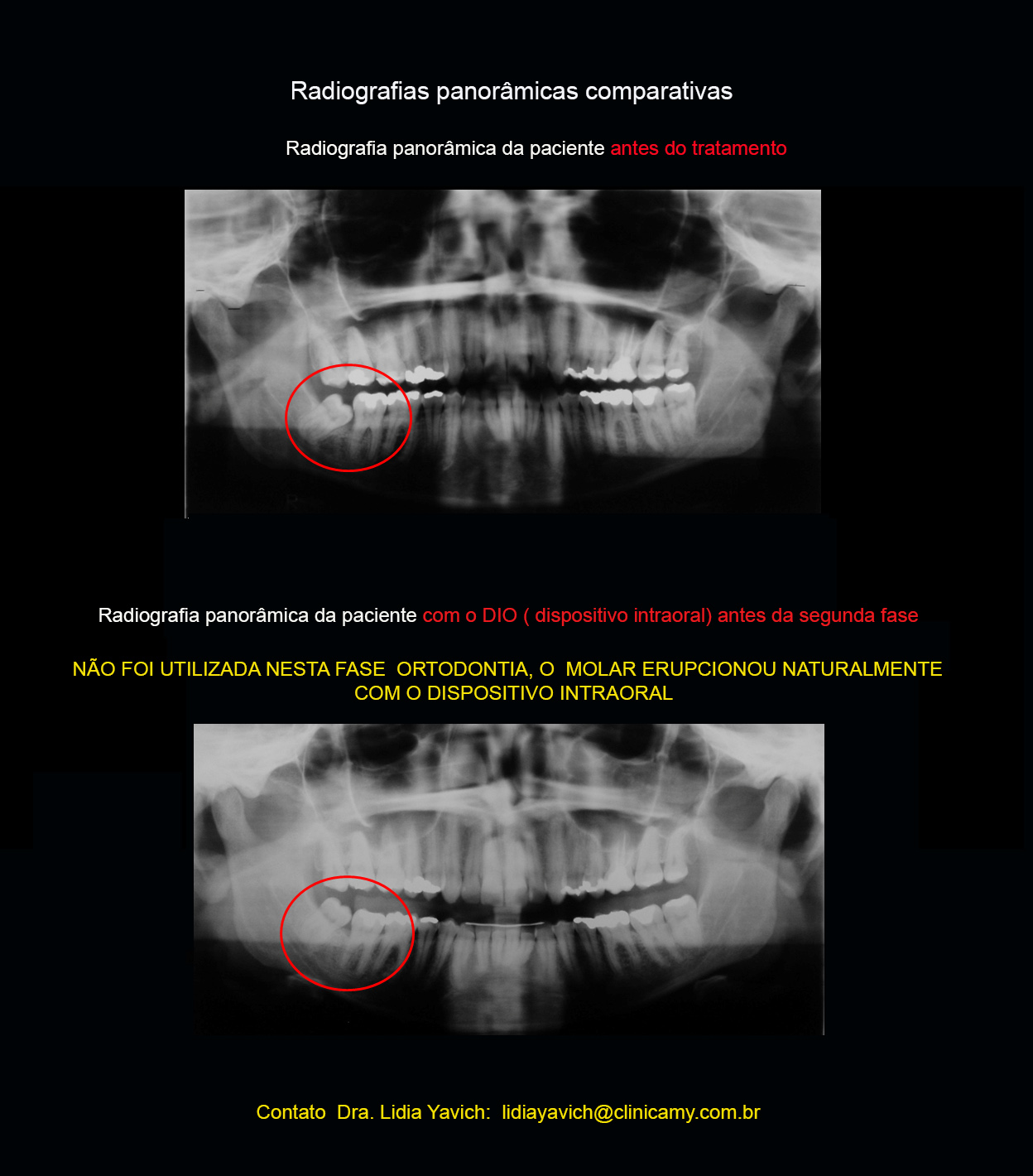 Radiografia panorâmica de controle da erupção ativa. Corresponde a sequencia mostrada na imagem anterior.