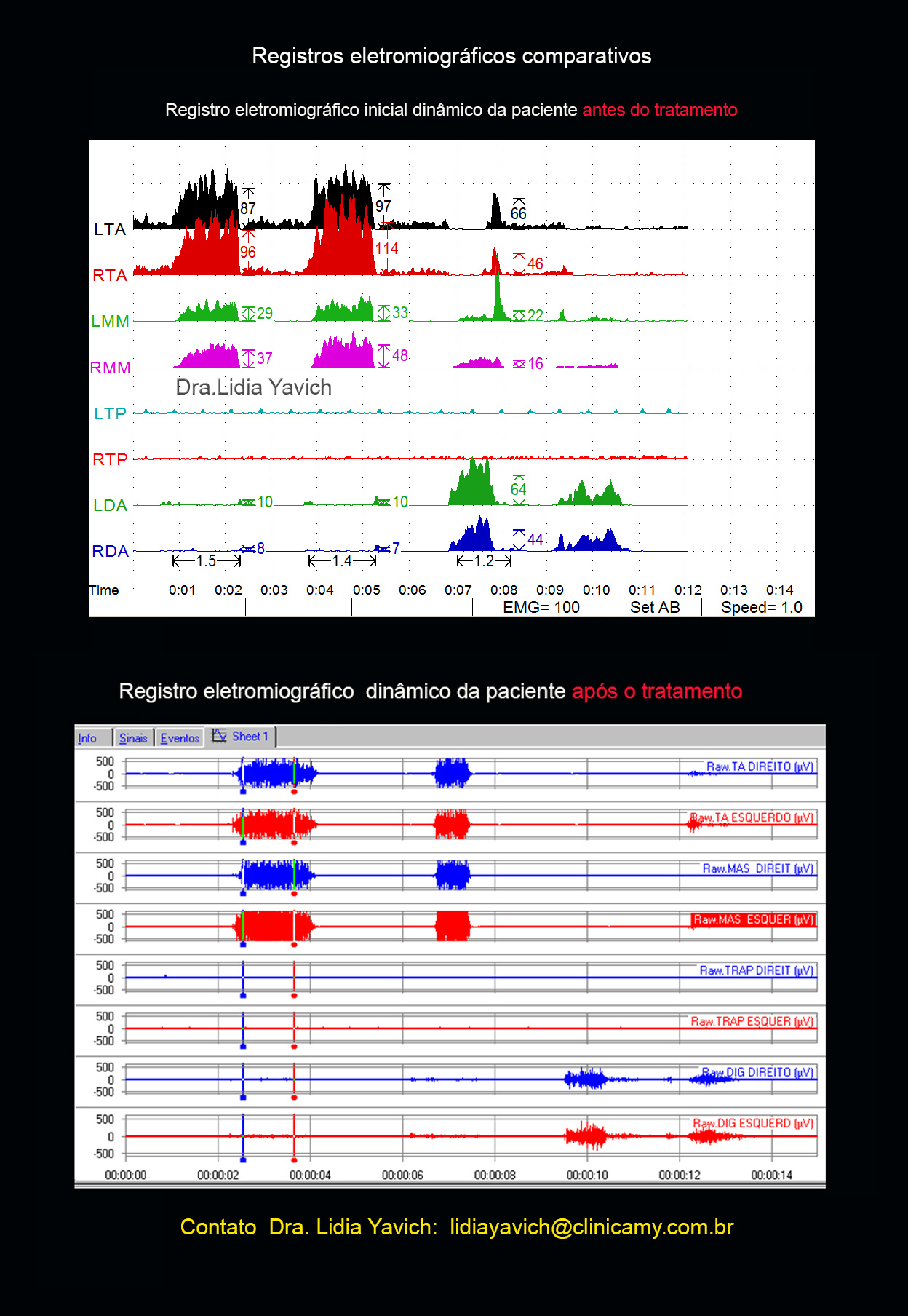 Comparação dos registros eletromiográficos da paciente antes e após o tratamento. Podemos analisar o equilíbrio e funcionamento dos masseteres, o que não acontecia no registro inicial.