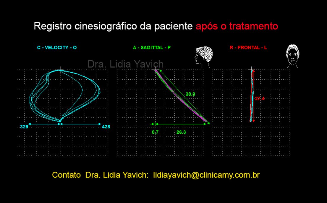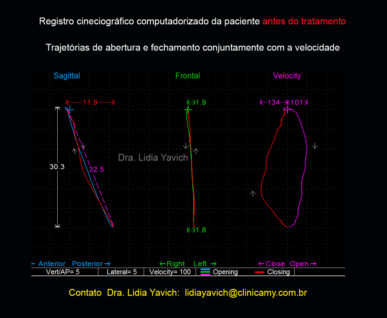 A cinesiologia computadorizada analisa o traçado dos movimentos que a mandíbula realiza nos três sentidos do espaço. A paciente tem uma abertura de 30 mm o que já é considerado uma limitação. A paciente não apresenta uma boa velocidade na abertura e fechamento mandibular. Isso pode ser um indicador de alterações musculares, lesões intra-articulares ou discrepâncias dentomusculares.