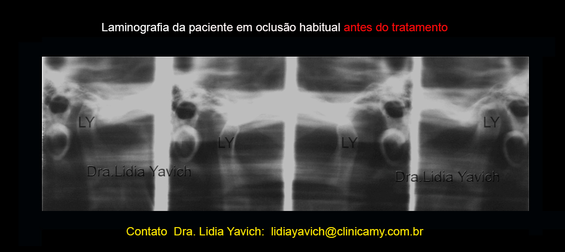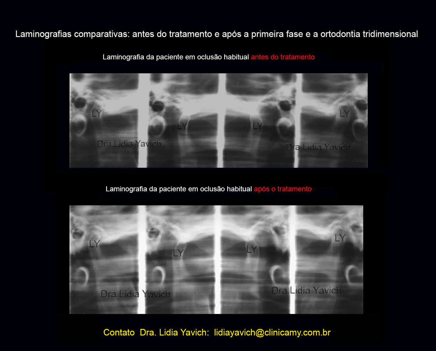 Laminografias comparativas da paciente: em oclusão habitual antes do tratamento e em oclusão neuromuscular fisiológica na finalização do tratamento.