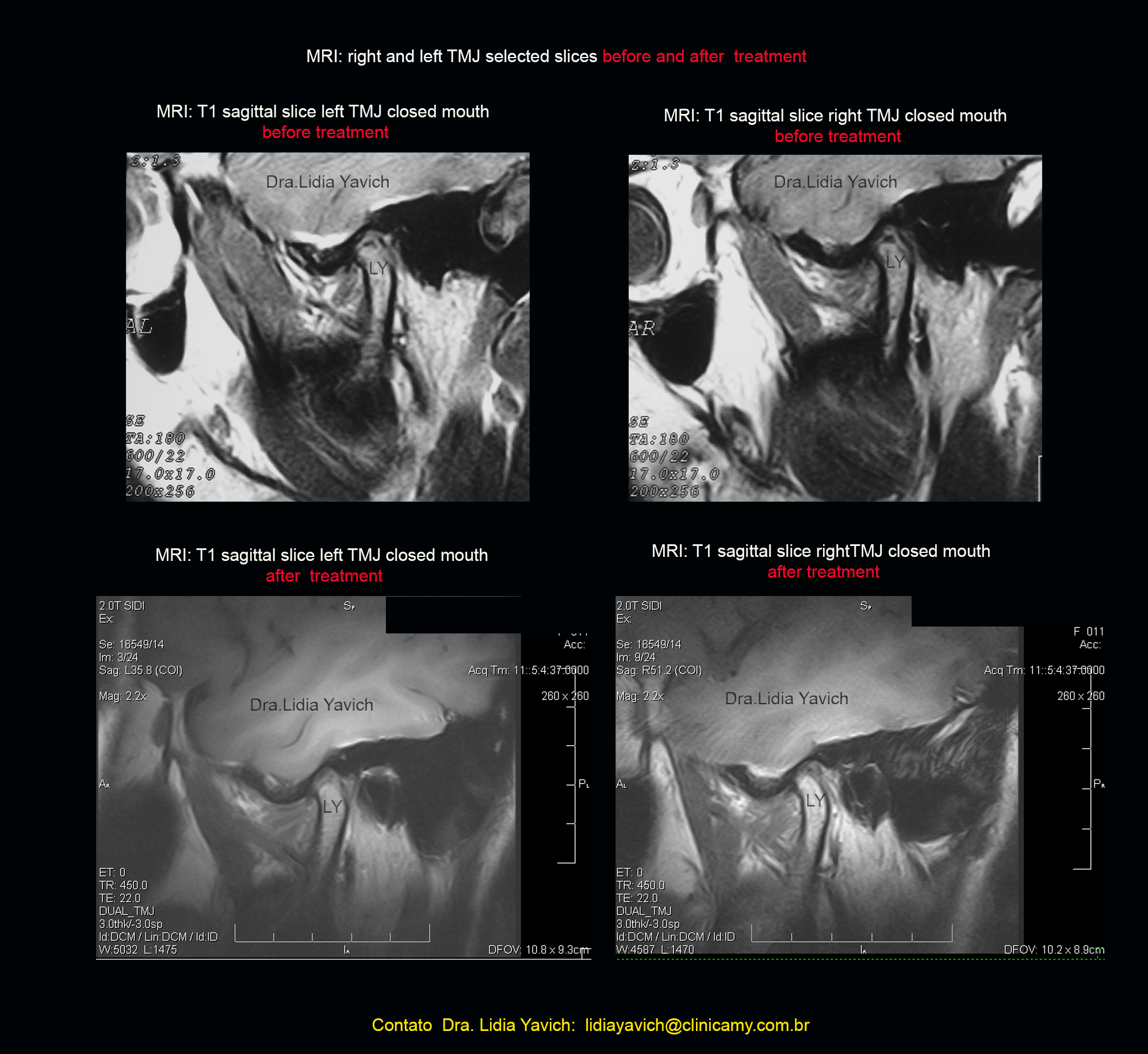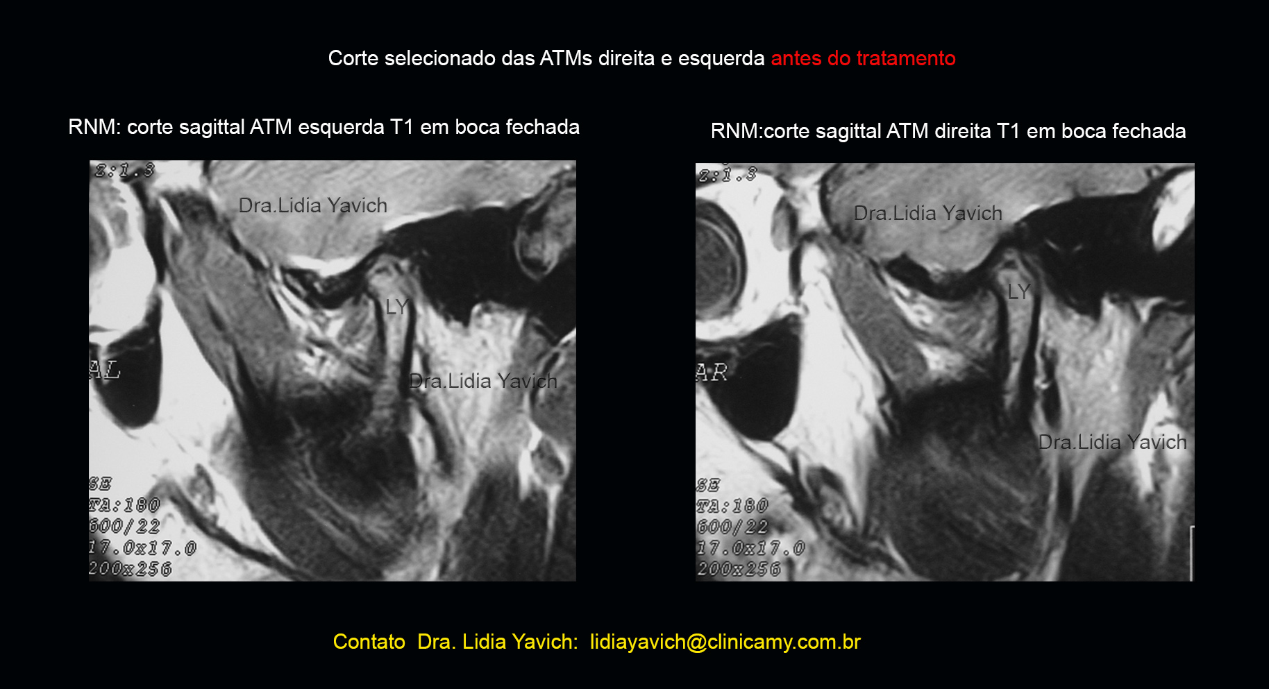 RNM (ressonância nuclear magnética) comparativas da paciente em oclusão habitual antes do tratamento e em oclusão neurofisiológica na finalização do tratamento.