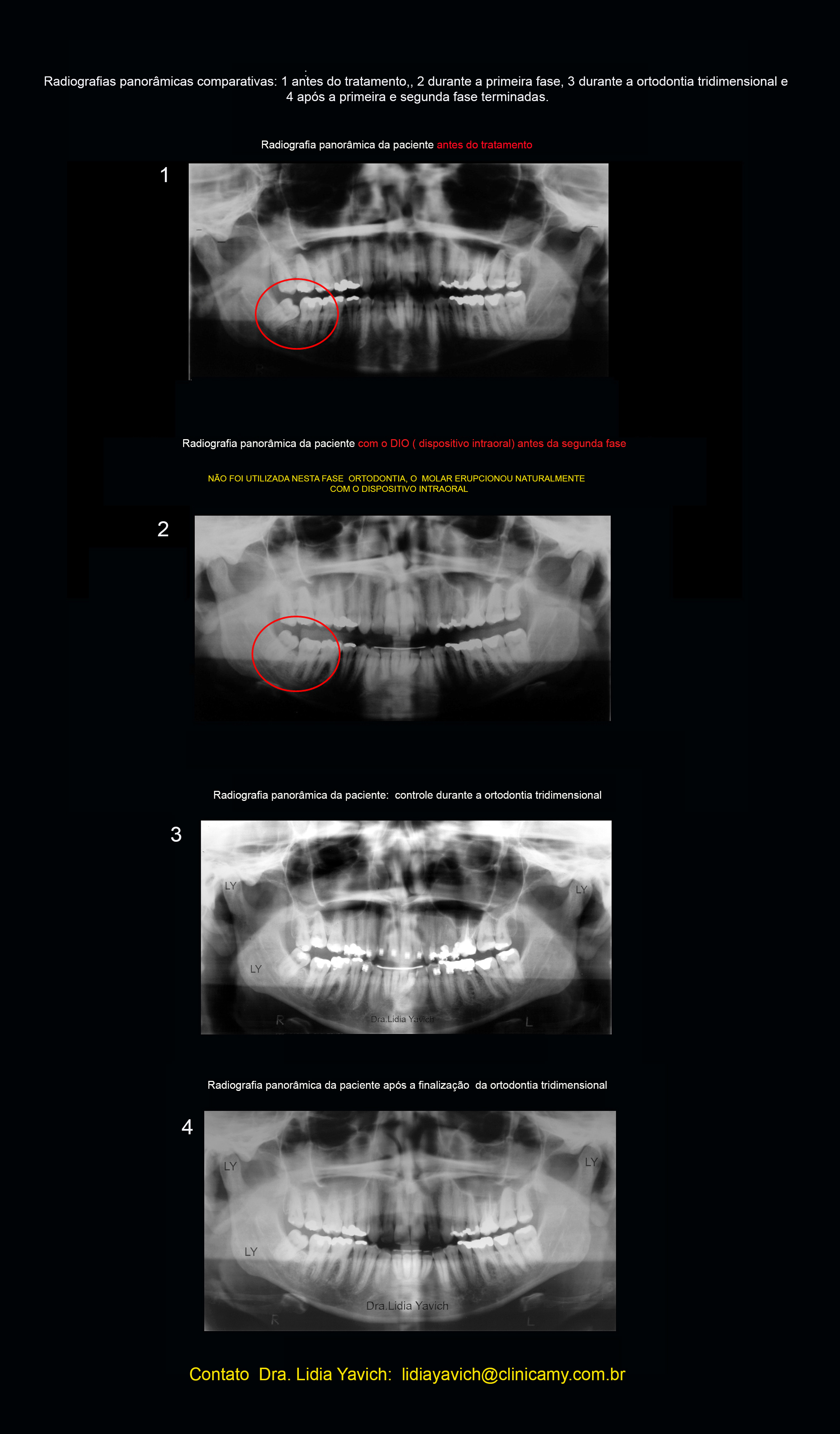 Radiografias panorâmicas da paciente comparativas: 1 antes do tratamento, 2 durante a primeira fase, 3 durante a ortodontia tridimensional, 4 após a finalização da ortodontia tridimensional.