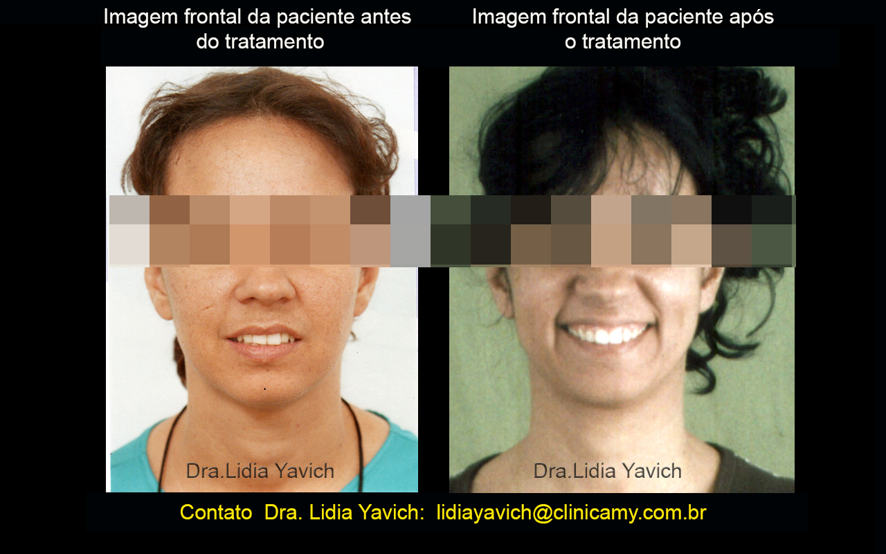 Imagem comparativa frontal da paciente antes e após o tratamento.