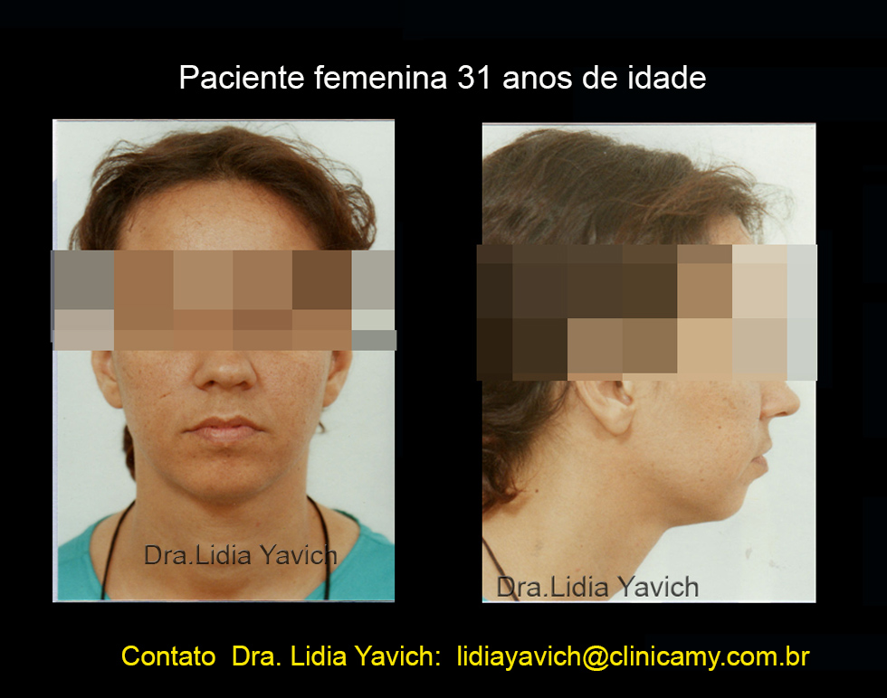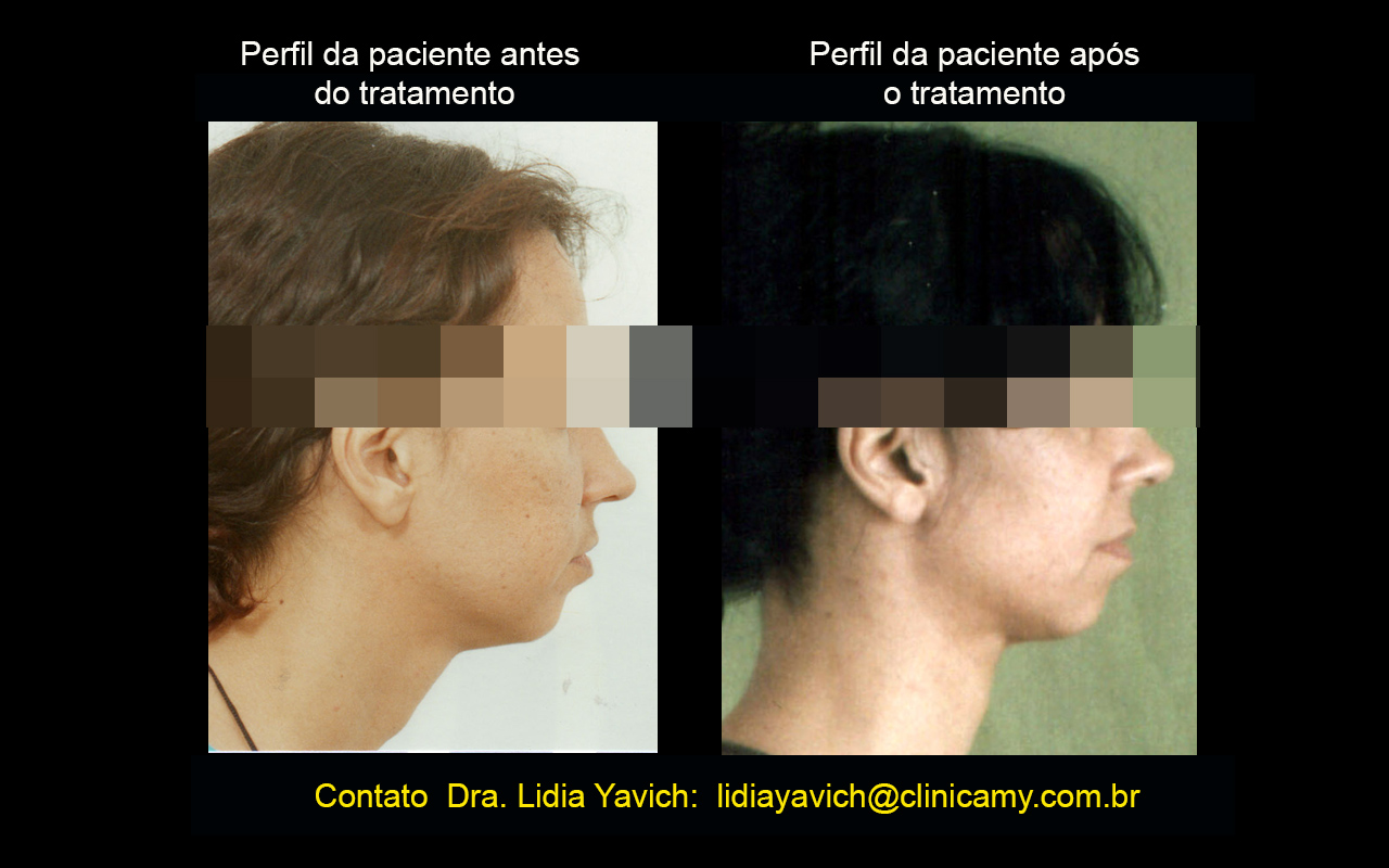 Imagem comparativa de perfil da paciente antes e após o tratamento.