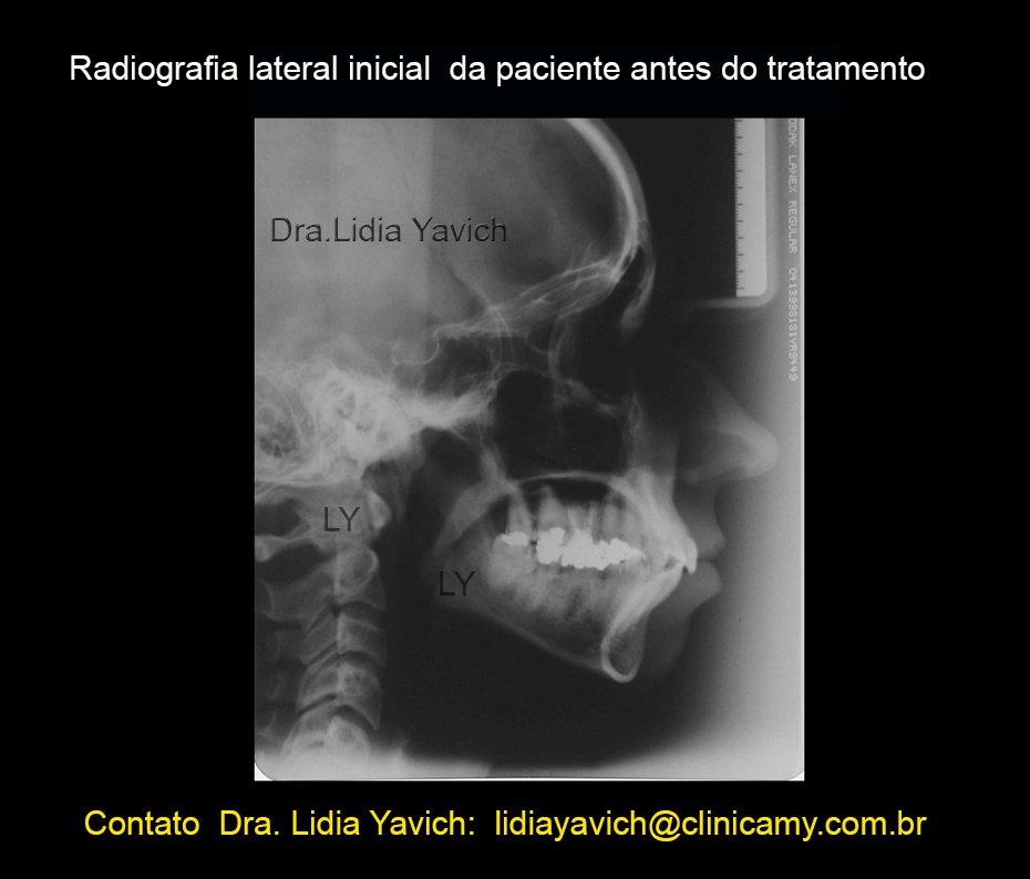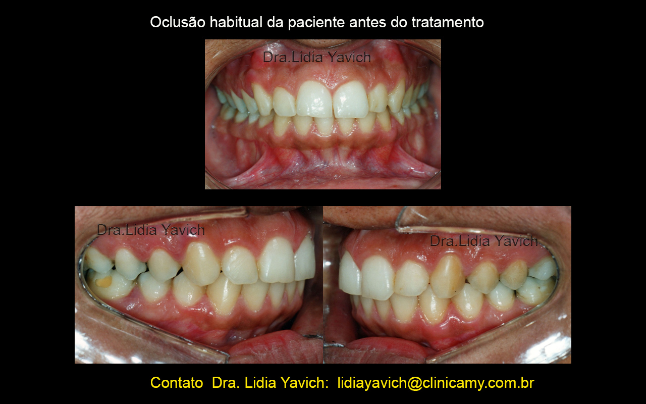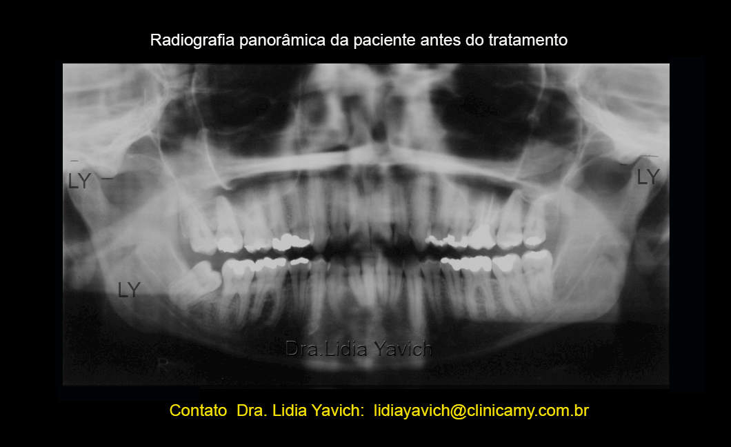 A paciente refere que usou aparelho ortodôntico removível e também fixo dos 15 aos 18 anos. Refere um traumatismo no setor anterior pelo qual o incisivo fraturou a borda incisal, quando criança. (ver a publicação Modificações estruturais do processo condilar como uma das sequelas de traumatismo na infância)