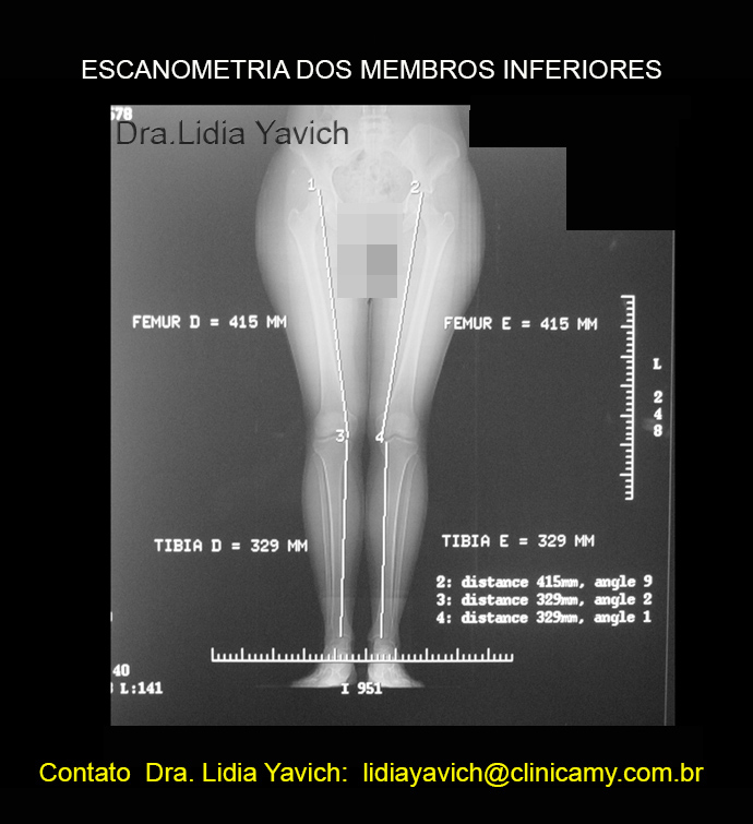Em certo momento foi solicitado para a paciente uma escanometria dos membros inferiores, já que se suspeitava de uma diferença de comprimento dos membros inferiores. No caso da paciente revelou ser só um encurtamento muscular, já que estruturalmente seus membros inferiores apresentavam a mesma medida.