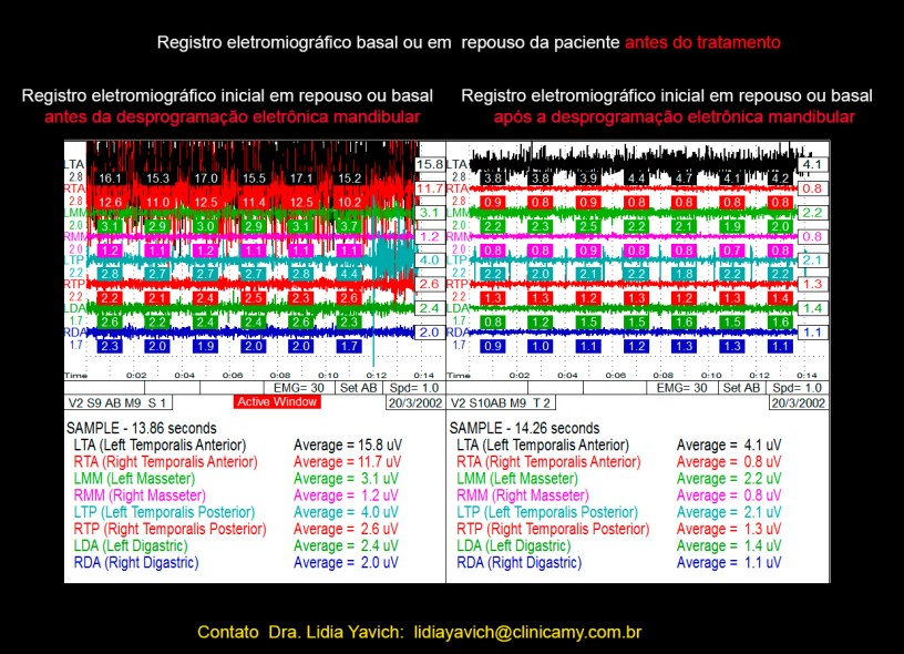 Nesta eletromiografia basal os músculos mastigatórios estão em hiperatividade, após a desprogramação eletrônica, os músculos abaixaram os seus valores.