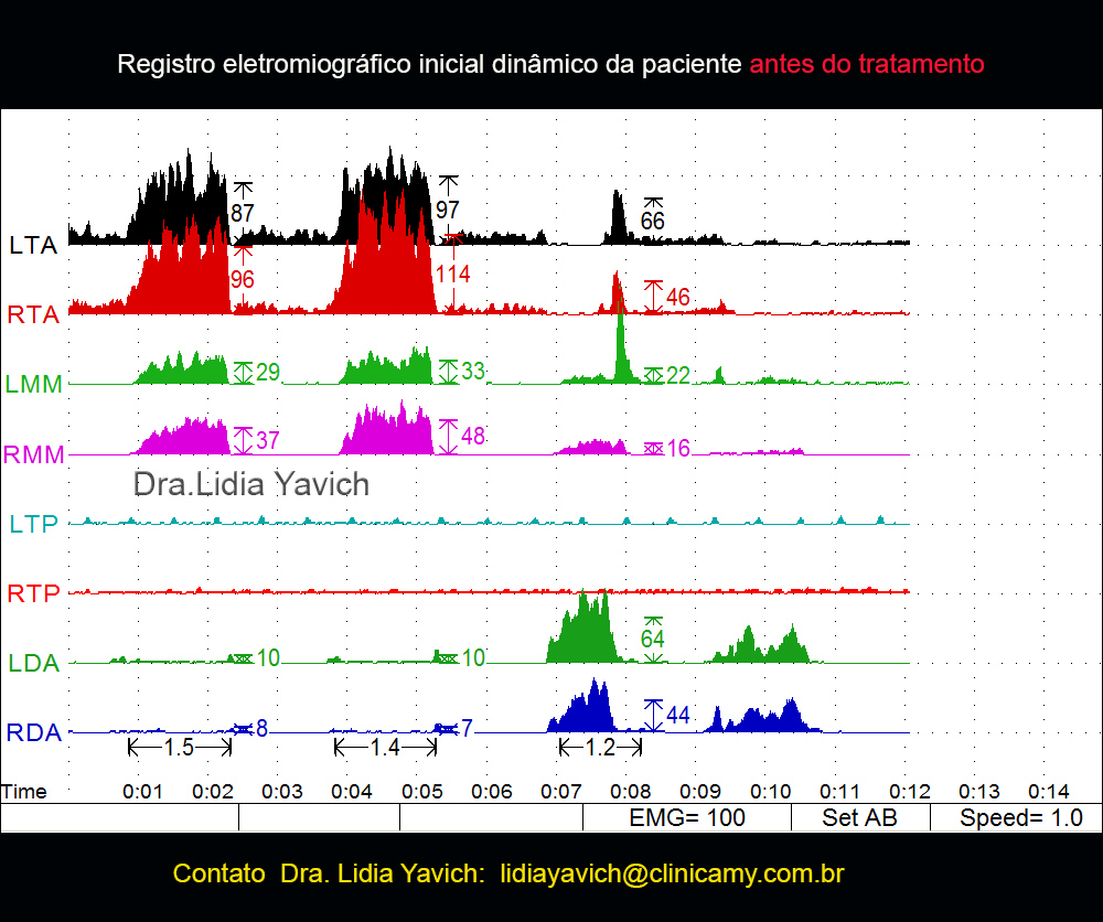 Nesta eletromiografia dinâmica, a paciente morde forte duas vezes, abre a boca, fecha e deglute. Os músculos masseteres, que são os mais potentes do sistema estomatognático geram pouquíssima atividade em máxima oclusão. Já os temporais anteriores estão recrutando mais unidades motoras que os masseteres, o qual não é fisiológico em um sistema que funcione equilibradamente.