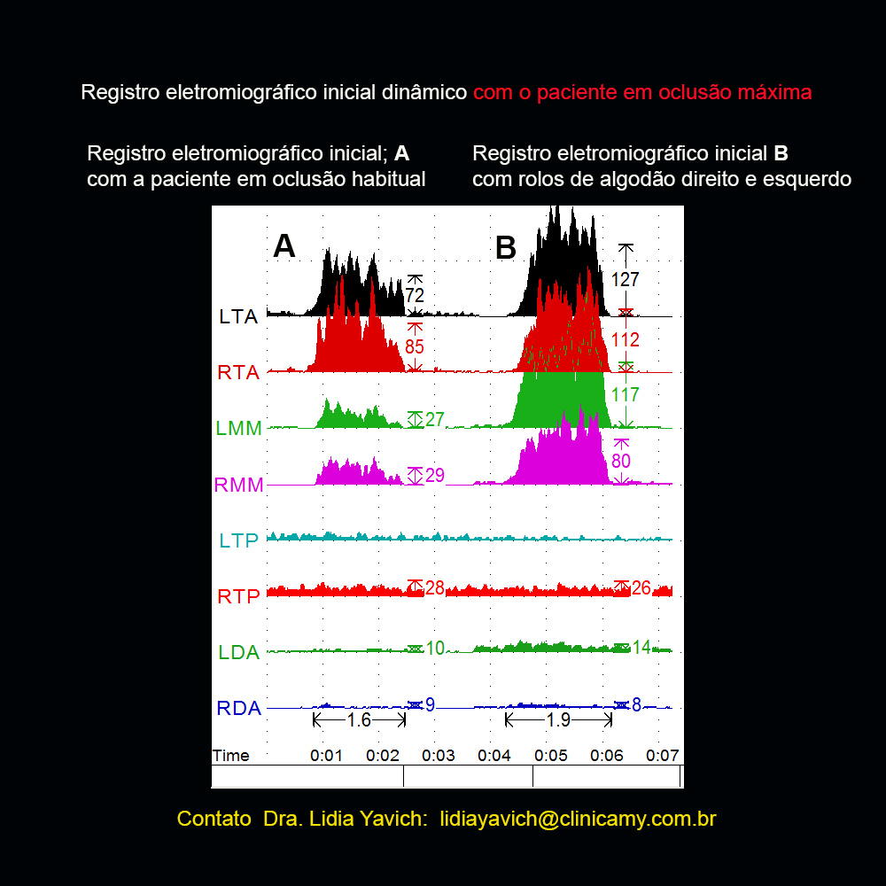 Nesta eletromiografia dinâmica a paciente morde em máxima intercuspidação habitual (A), em (B) com rolos de algodão entre as superfícies oclusais direita e esquerda onde a atividade melhora muito.
