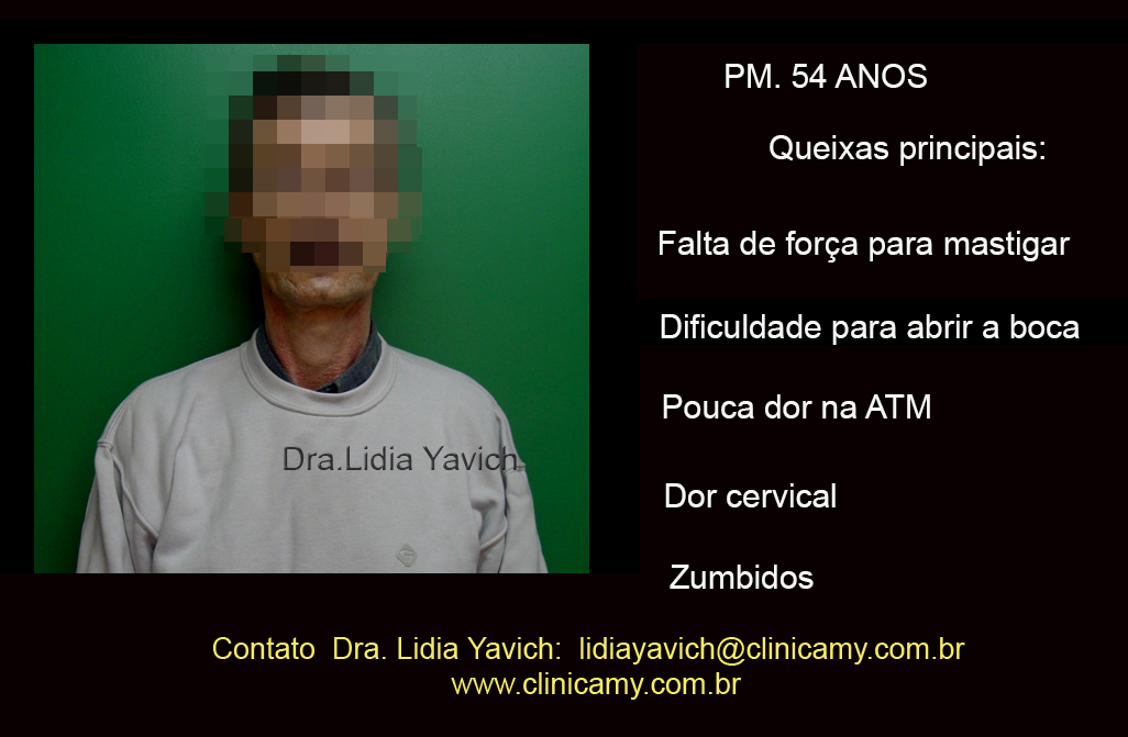 Paciente do sexo masculino de 57 anos de idade foi encaminhado para a clínica por seu dentista. Suas principais reclamações foram: falta de força ao mastigar, dificuldade em abrir a boca, dor cervical, dor nas ATMs e zumbido no ouvido esquerdo.