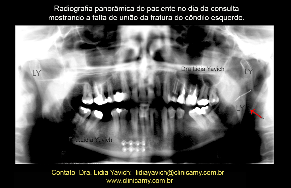 Após a realização de todas as avaliações clínicas foi solicitado uma radiografia panorâmica. Foi evidente a falta de união da fratura do côndilo mandibular esquerdo.