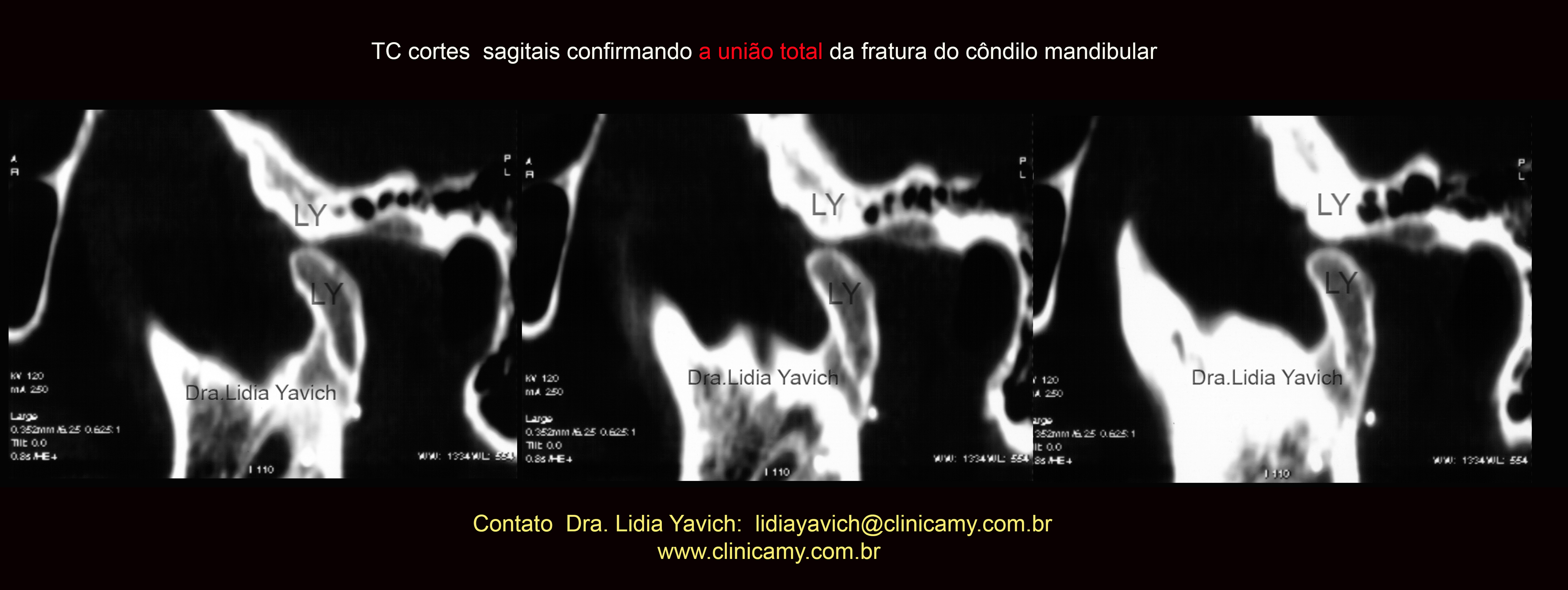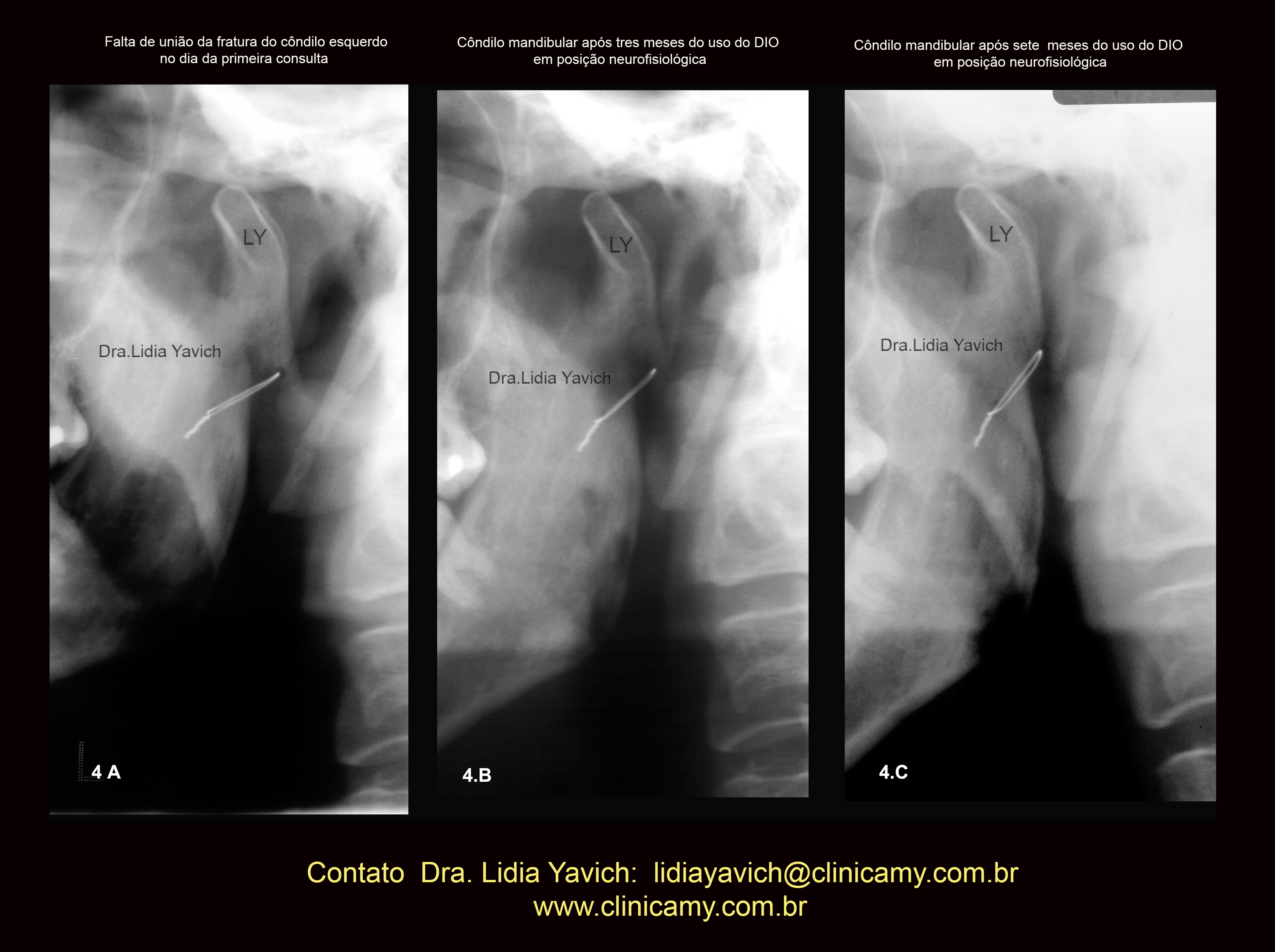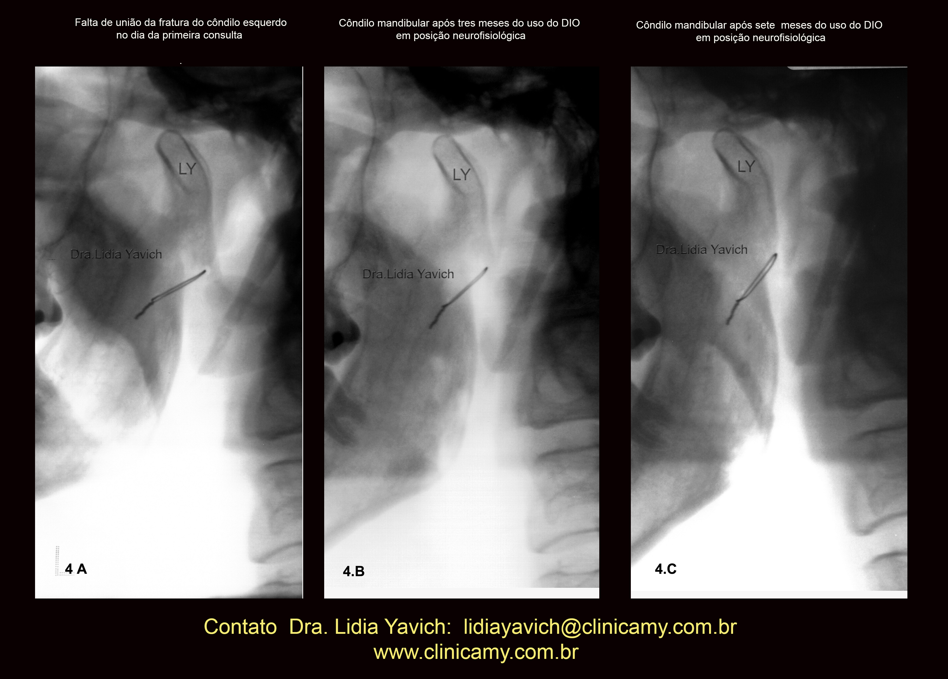 A nova radiografia panorâmica mostrou a melhora da posição do côndilo mandibular e finalmente quatro meses após este ultimo controle uma terceira radiografia panorâmica foi solicitada onde pode se observar a união da fratura.