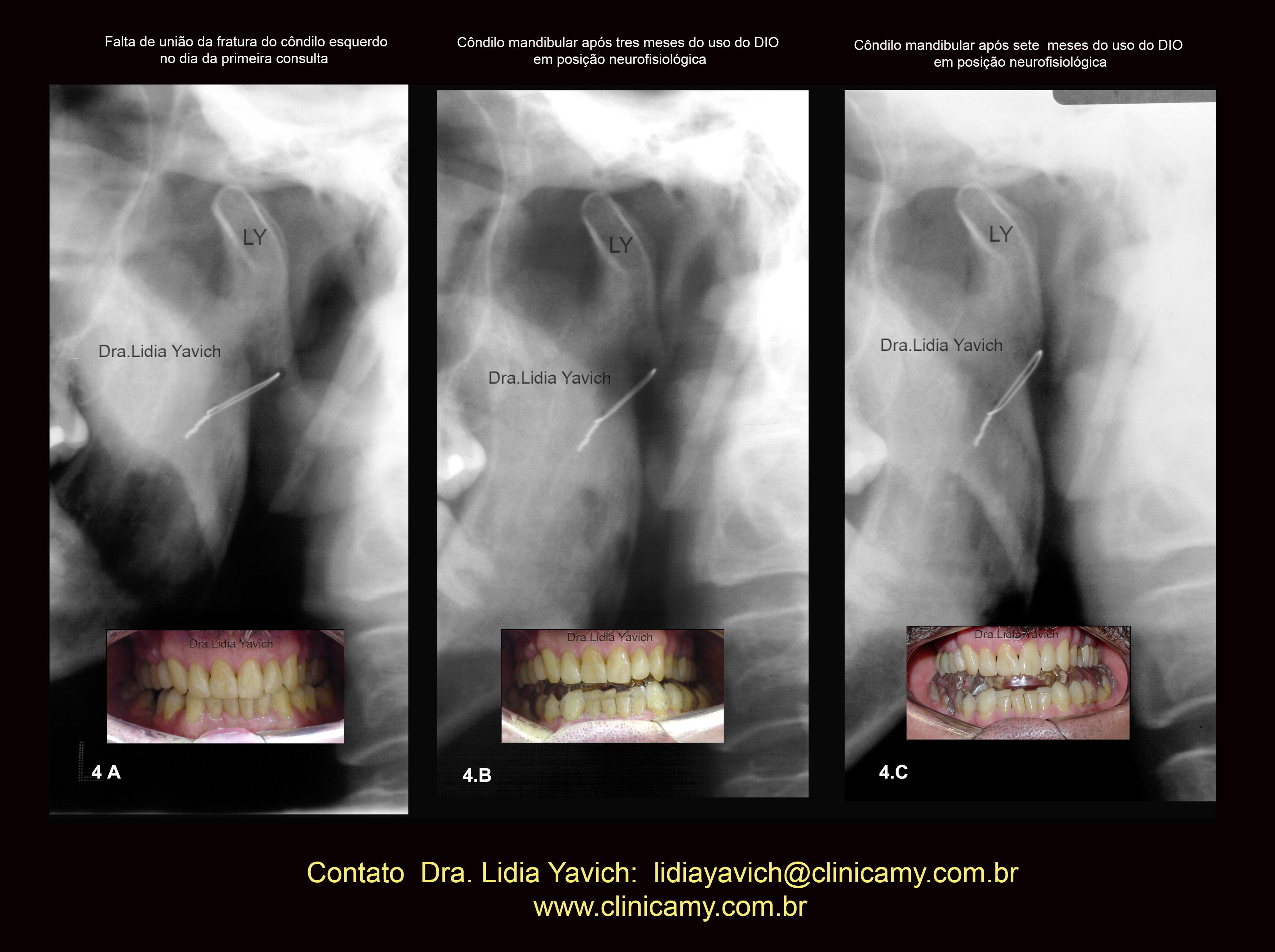 As imagens frontais da oclusão habitual no dia da consulta, quatro e sete meses após iniciado o tratamento estão também inseridas nesta imagem.