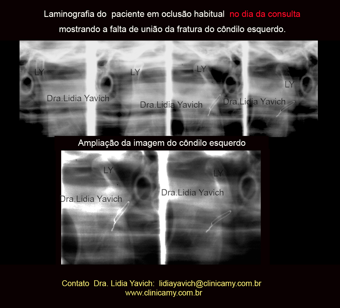 Laminografia das ATMs do paciente no dia da consulta evidenciando a falta de união da fratura do côndilo mandibular esquerdo.