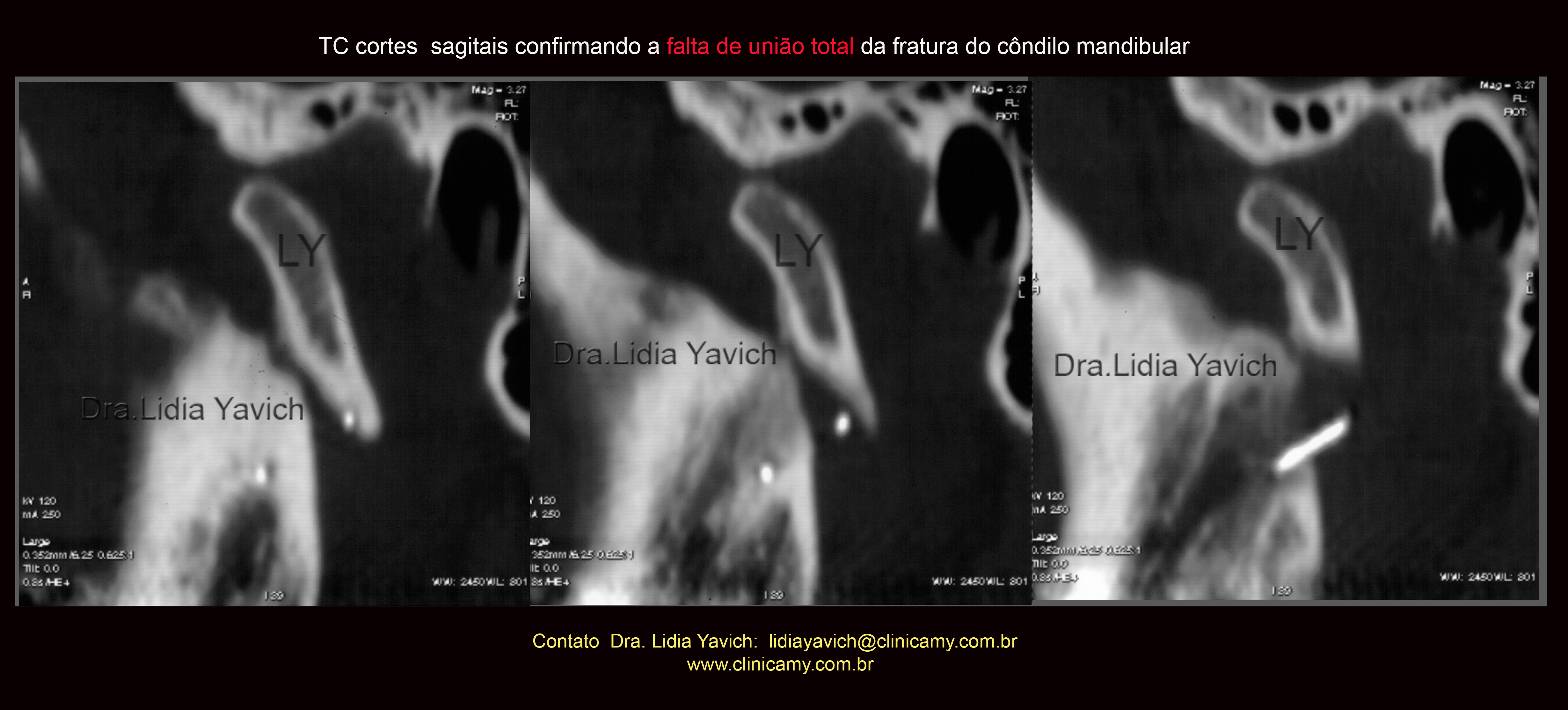 TC: cortes sagitais confirmando a falta de união total da fratura do côndilo mandibular, quatro meses após a cirurgia.