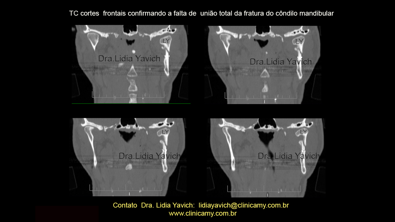 TC: cortes frontais confirmando a falta de união total da fratura do côndilo mandibular, quatro meses após a cirurgia.