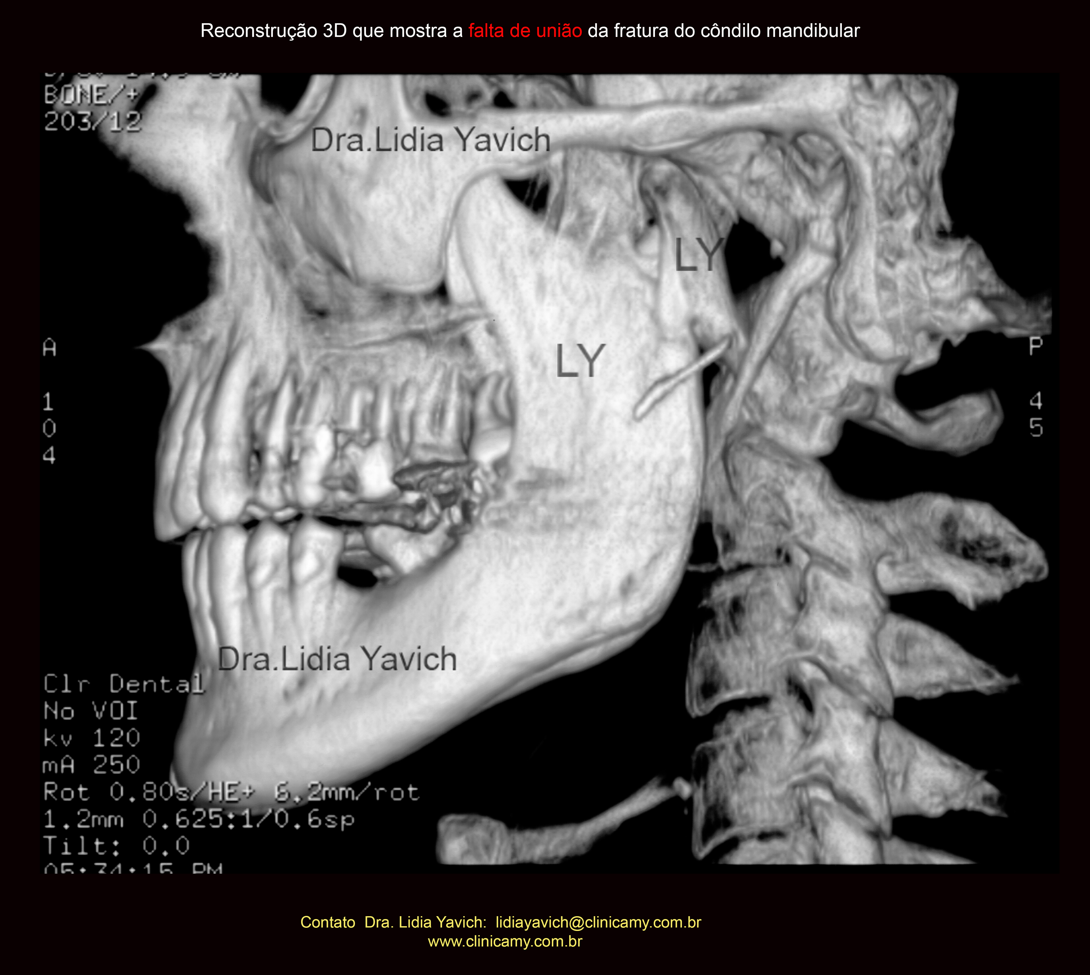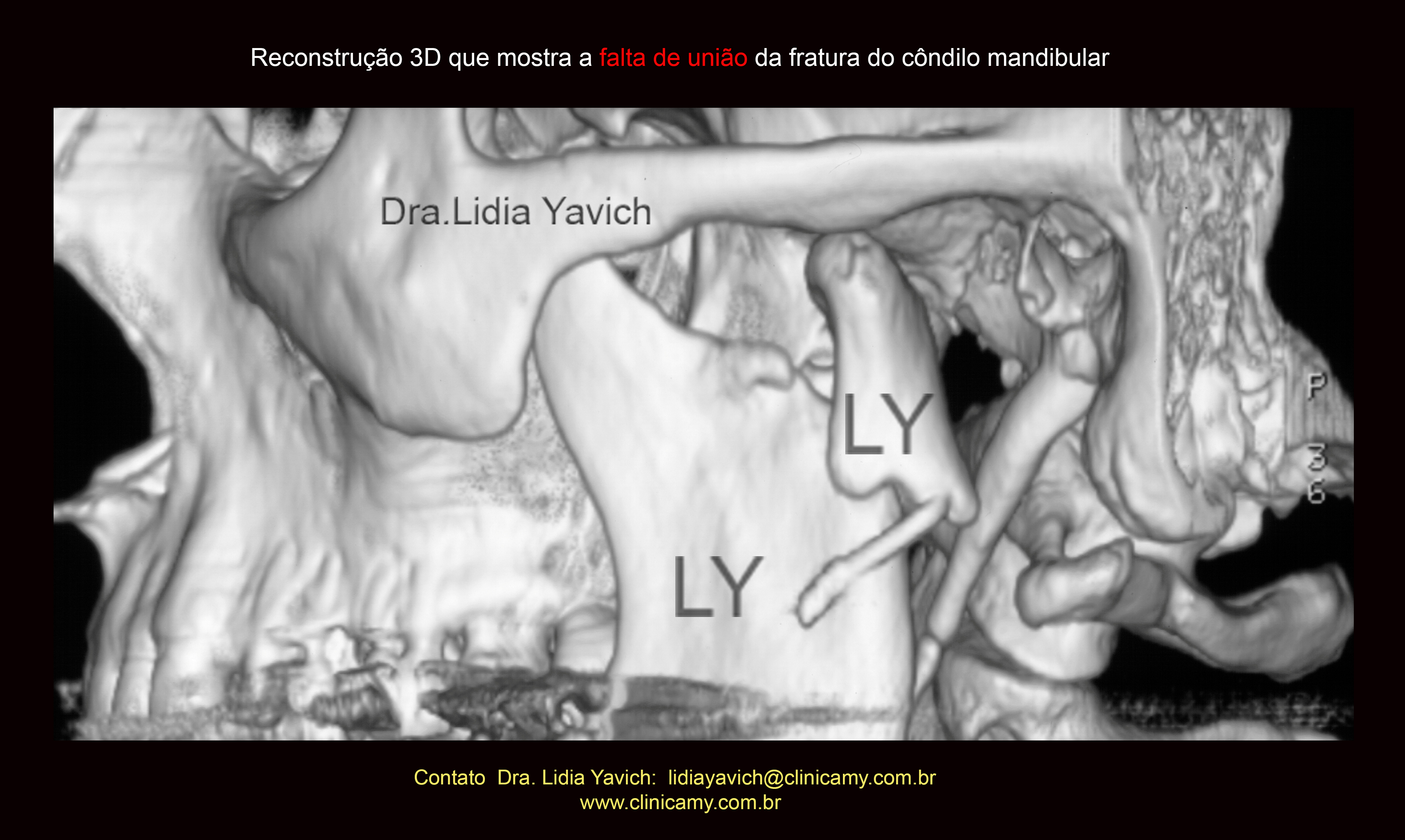 Reconstrução em 3D mostrando a falta de união total da fratura do côndilo mandibular, quatro meses após a cirurgia.