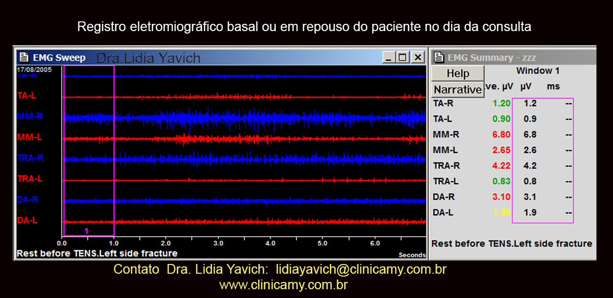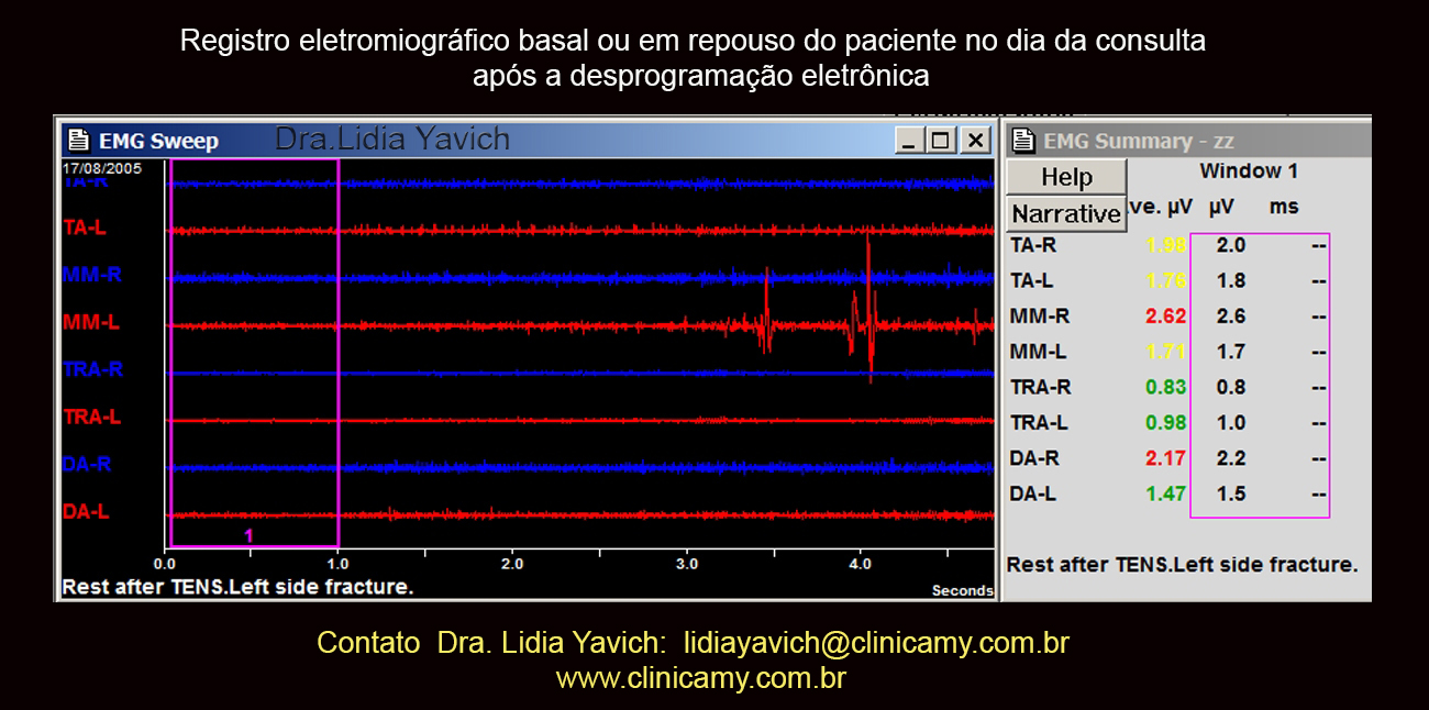 Registros eletromiográficos comparativos antes e após a desprogramação eletrônica na primeira consulta do paciente.