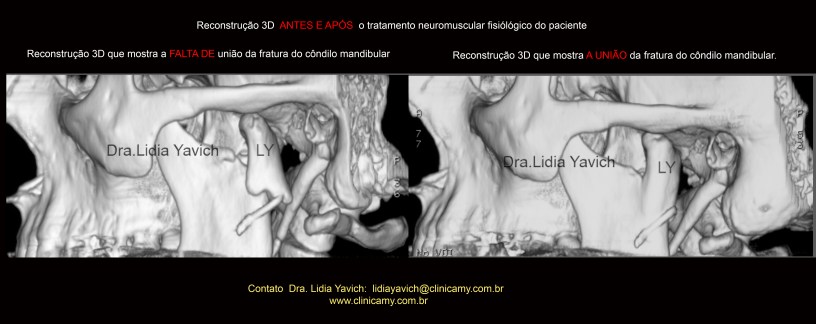 Reconstrução em 3D mostrando a falta de união do côndilo mandibular esquerdo após quatro meses da cirurgia e a posterior união do côndilo mandibular após o tratamento neurofisiológico.