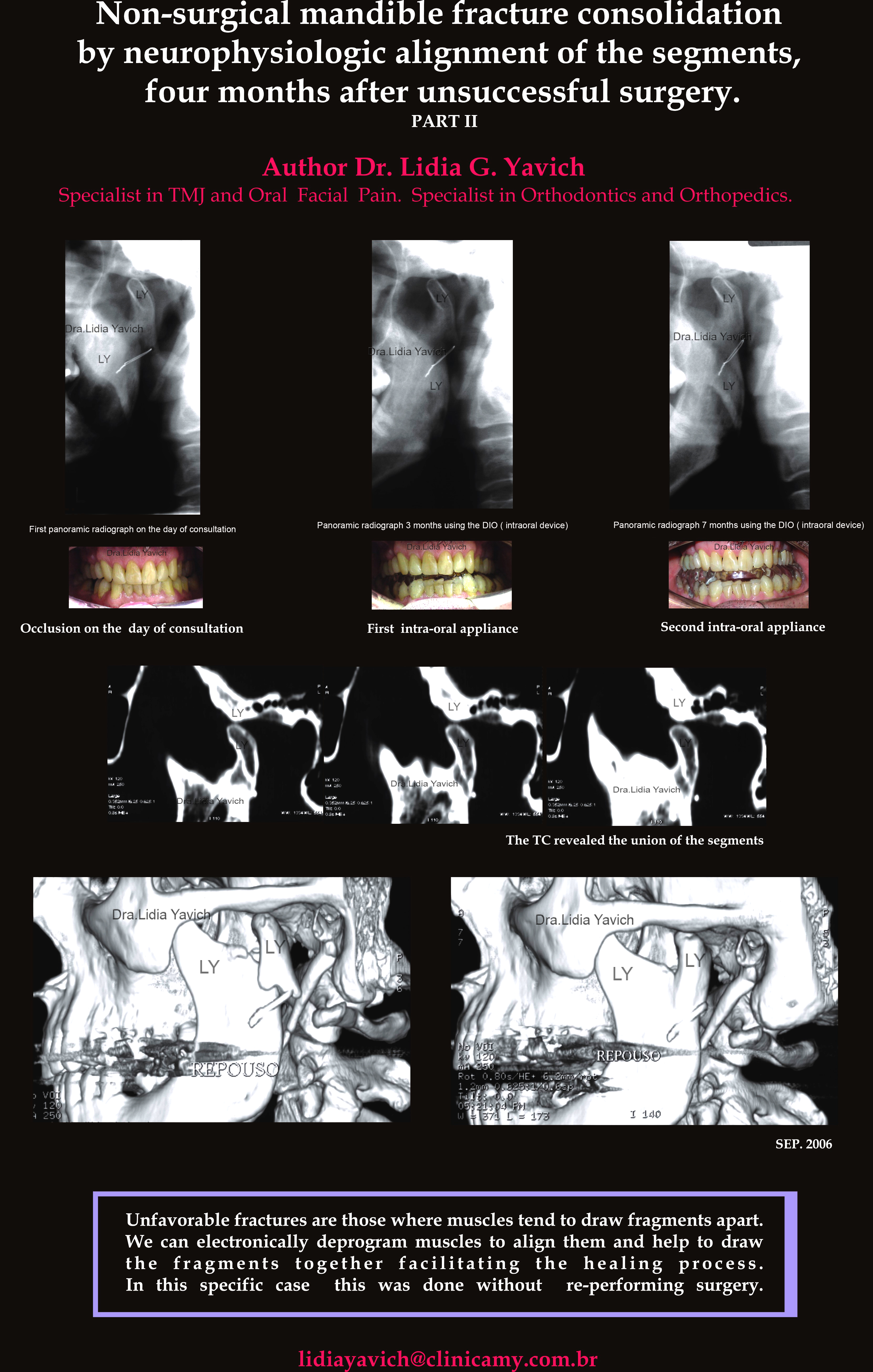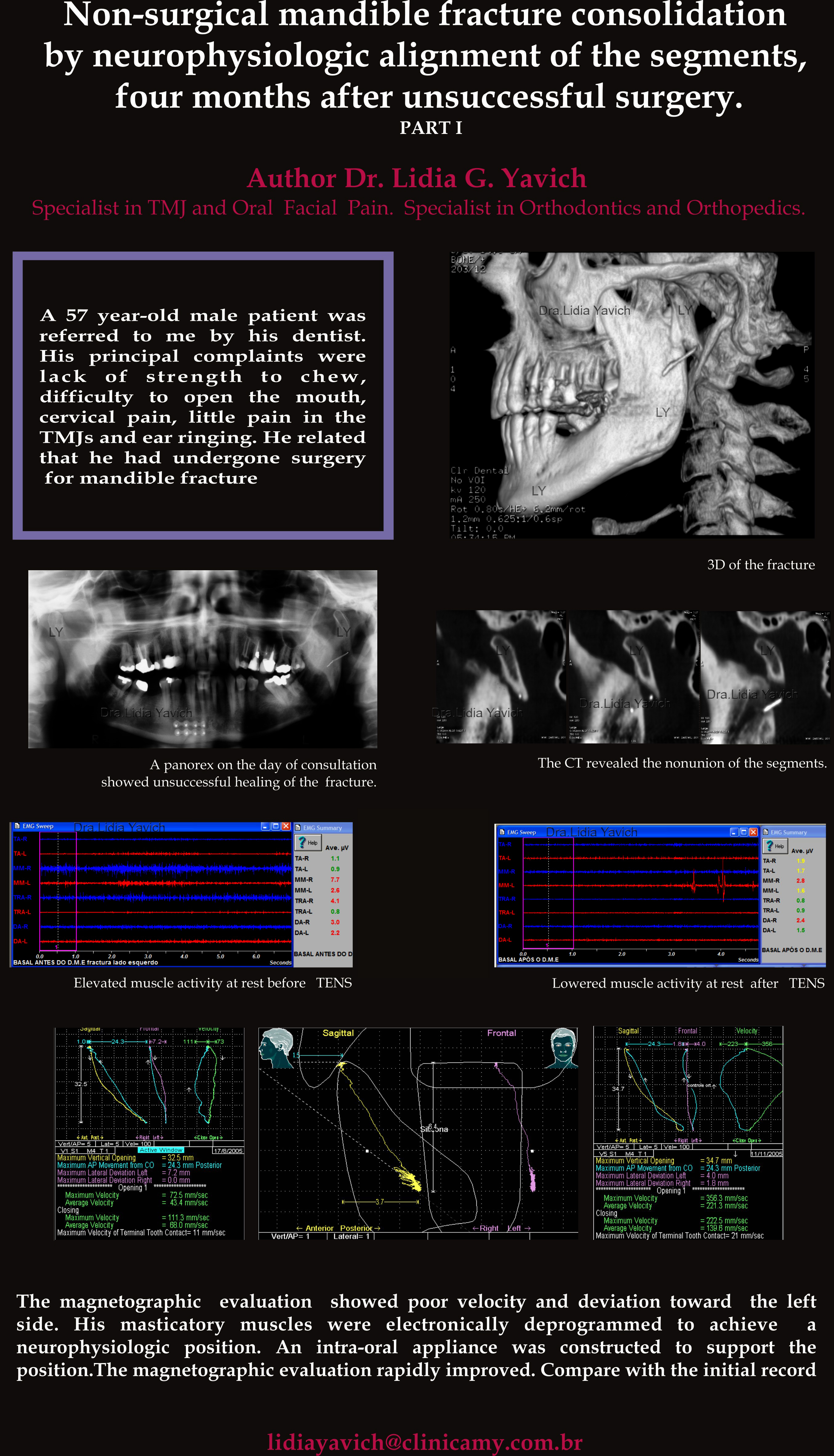 O presente caso clínico documenta um paciente do sexo masculino de 57 anos de idade com uma complicação por falta de união do côndilo mandibular esquerdo quatro meses após a cirurgia e a resolução deste caso com um alinhamento neuromuscular fisiológico dos segmentos, sem uma nova cirurgia ou fixação interna.