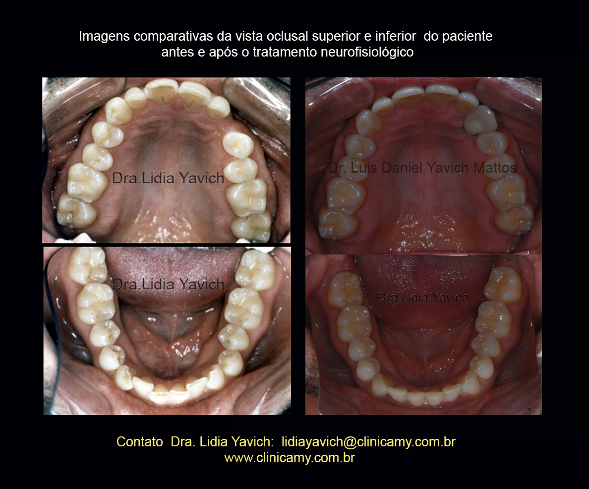 Imagens comparativas da vista oclusal superior e inferior  do paciente antes e após o tratamento neuromuscular fisiológico.