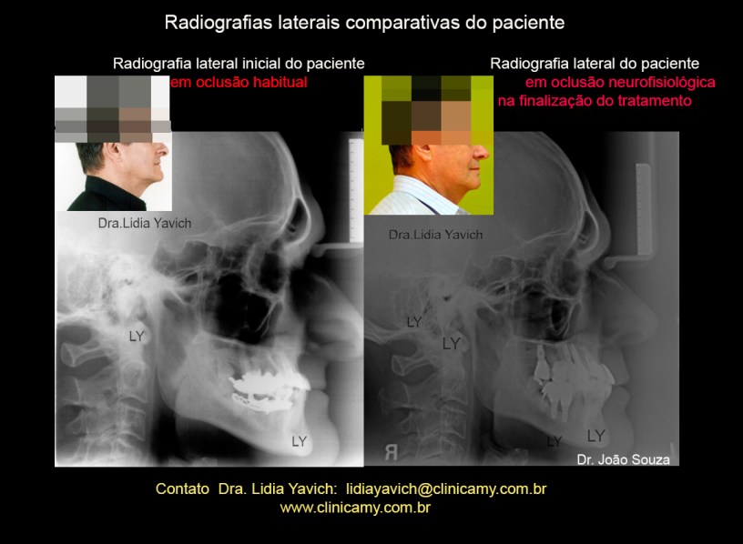 Radiografias laterais comparativas do paciente: antes e após a finalização do tratamento neurofisiológico.