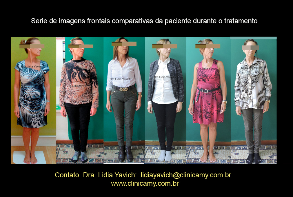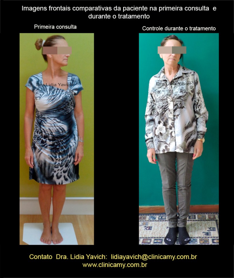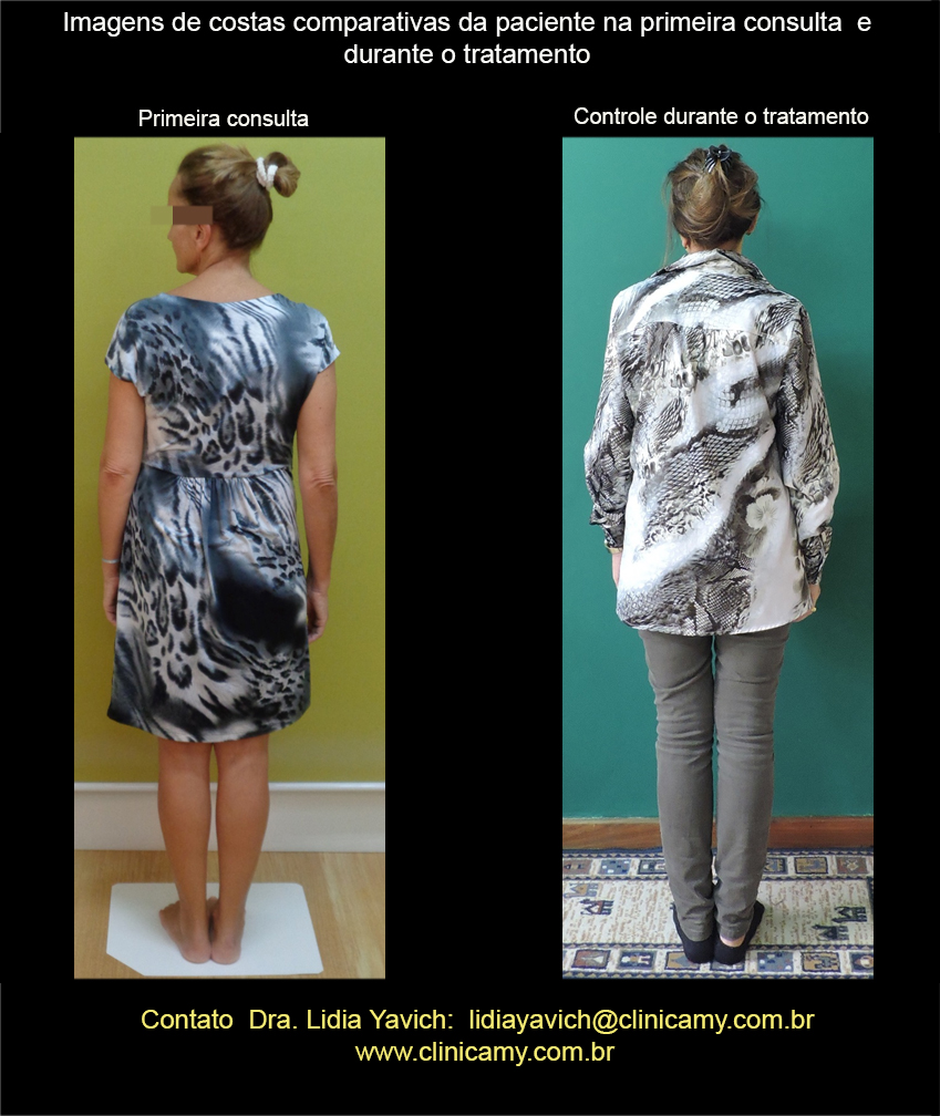 Imagens de costas comparativas da paciente na primeira consulta e durante o tratamento.