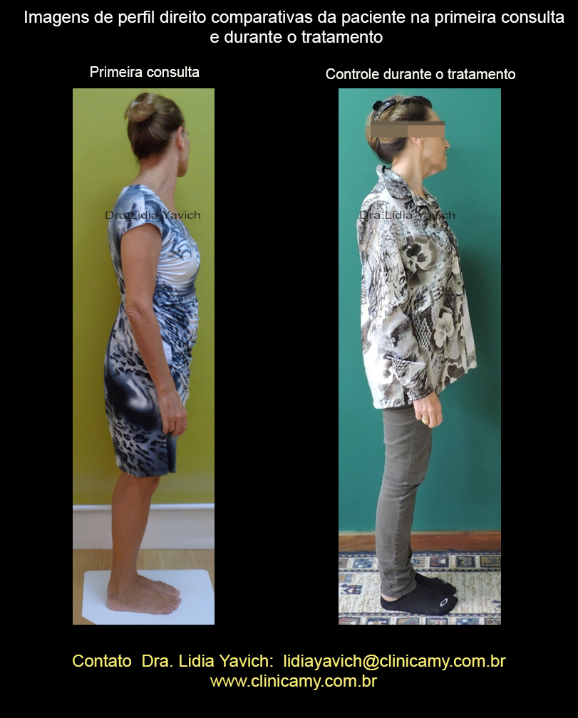 Imagens de perfil direito comparativas da paciente na primeira consulta e durante o tratamento.