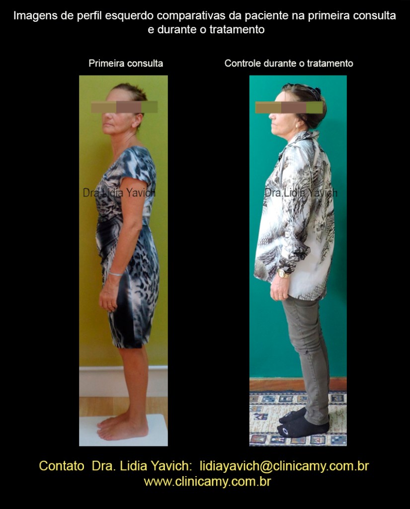 Imagens de perfil esquerdo comparativas da paciente na primeira consulta e durante o tratamento.