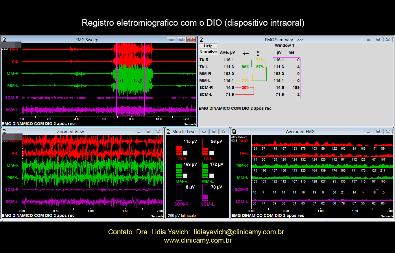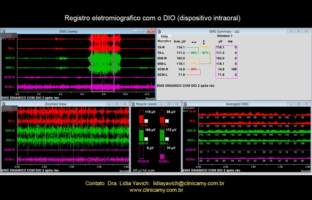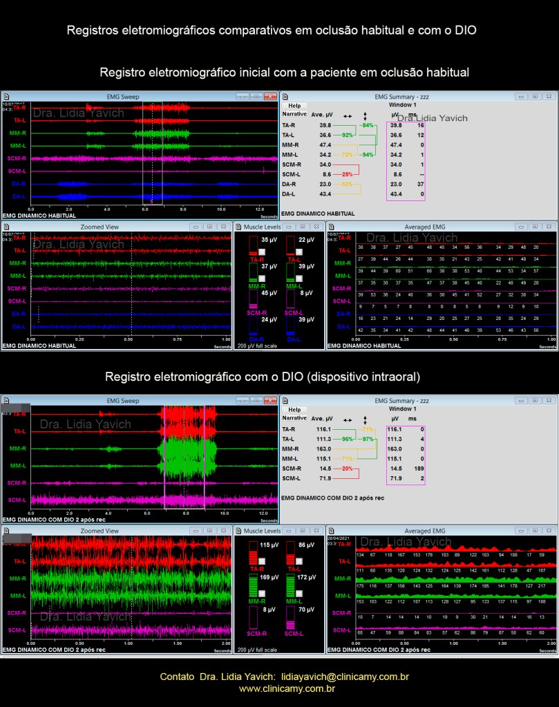 Registros eletromiográficos comparativos em oclusão habitual e com o DIO (dispositivo intraoral) instalado.